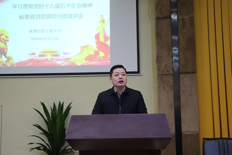 【本网讯】根据省委教育工委的统一部署,11月23日上午,学习贯彻党的十九届五中全会精神省委宣讲团高校分团走进三亿网航空港校区。省委宣讲团成员、四川省社会科学院副院长郑泰安研究员就党的十九届五中全会精神进行了深入宣讲。学校师生代表近300人到场聆听,宣讲会由省纪委监委驻校纪检监察组组长、学校党委副书记、纪委书记雷超主持。