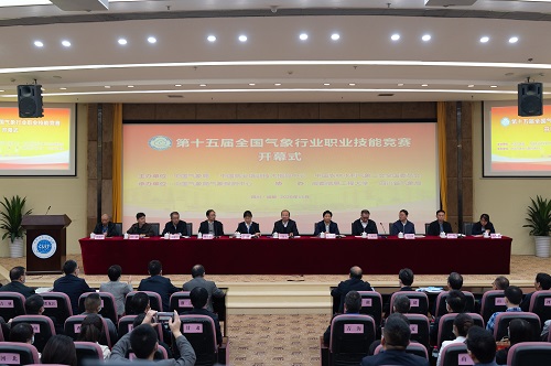 【本网讯】11月17日上午,第十五届全国气象行业职业技能竞赛暨第四届全国气象行业县级综合气象业务职业技能竞赛开幕式在我校航空港校区国际会议厅举行。中国气象局党组成员、副局长于新文,中国农林水利气象工会全国委员会主席蔡毅德,四川省气象局局长杨卫东,我校校长余敏明等出席了开幕式。开幕式由中国气象局综合观测司副司长裴翀主持。