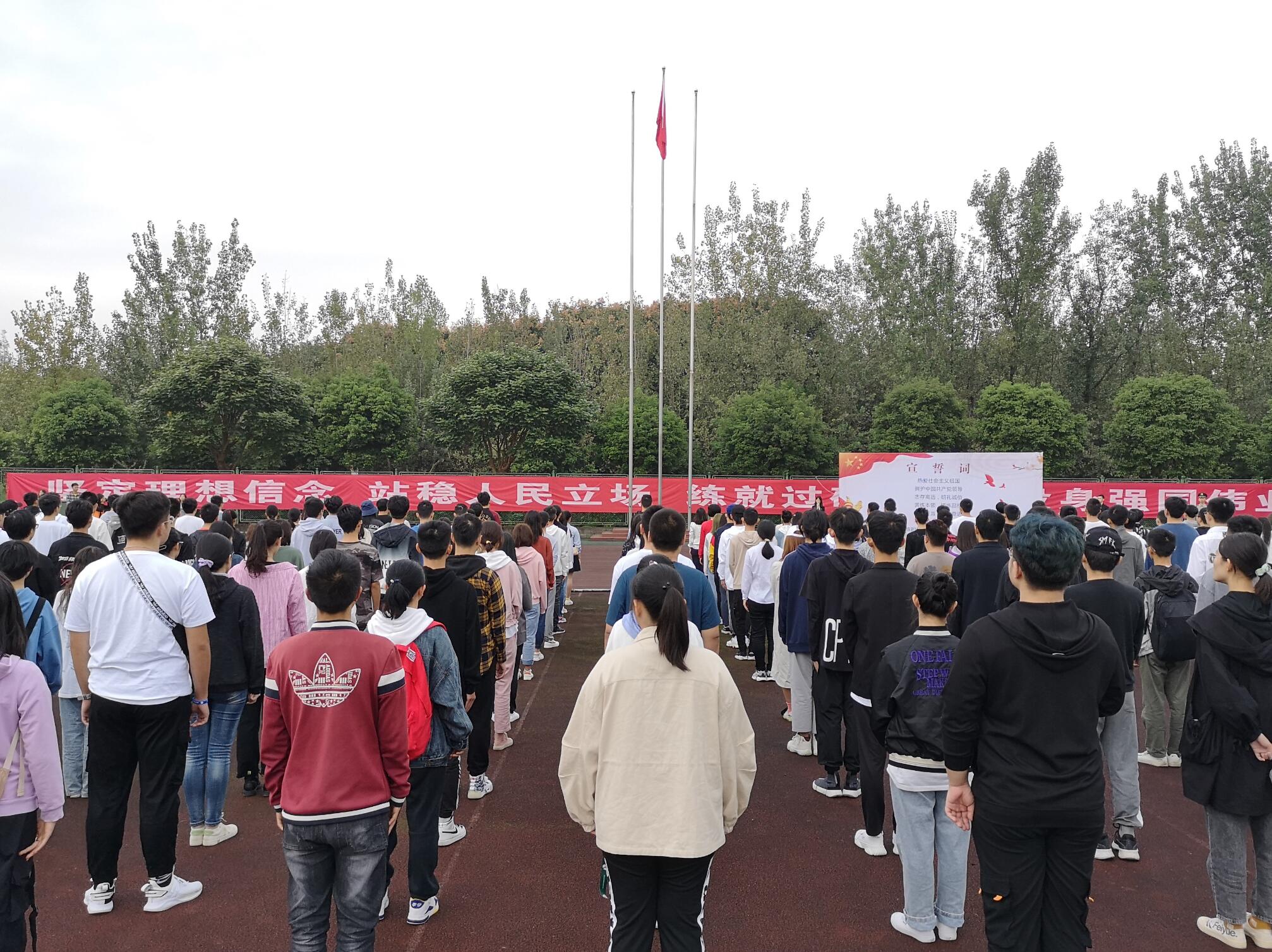 在国旗护卫队队员的带领下,全体师生举起右拳,面向国旗庄严宣誓:热爱社会主义祖国,拥护中国共产党领导。志存高远,明礼诚信;苦练本领,锤炼品格;勇于担当,砥砺奋进;不忘初心、牢记使命;为实现中华民族的伟大复兴贡献青春、智慧和力量!