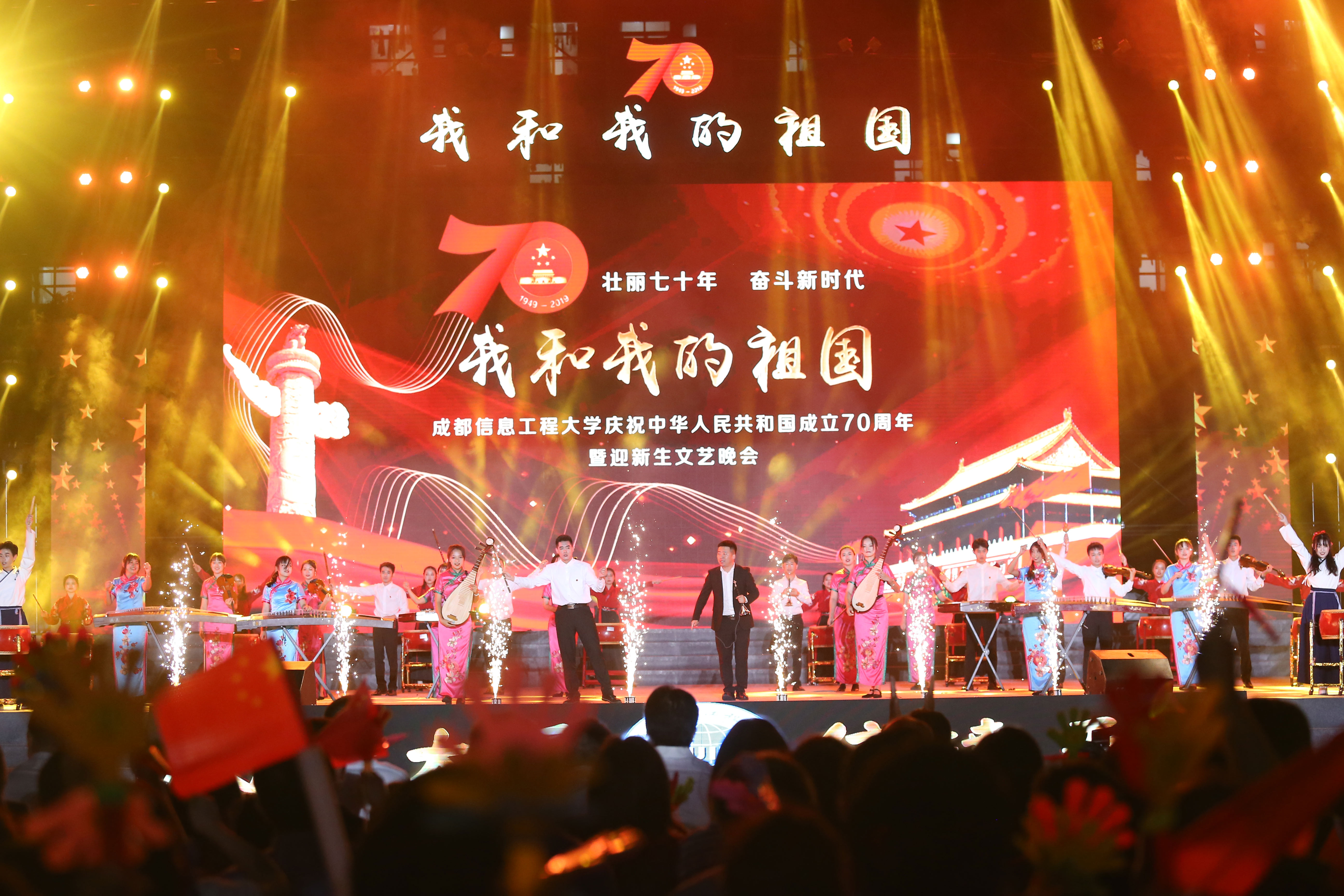 【本网讯】栉风沐雨七十载,逐梦奋斗新时代。9月28日晚,学校在航空港校区第一田径场隆重举行庆祝中华人民共和国成立70周年暨迎新生文艺晚会。学校老领导,现任学校全体校领导,校友代表,离退休教师代表,相关职能部门、各学院负责人,教职工代表和2019级全体新生共同观看了晚会,逾万名师生及家长通过网络直播观看了晚会。