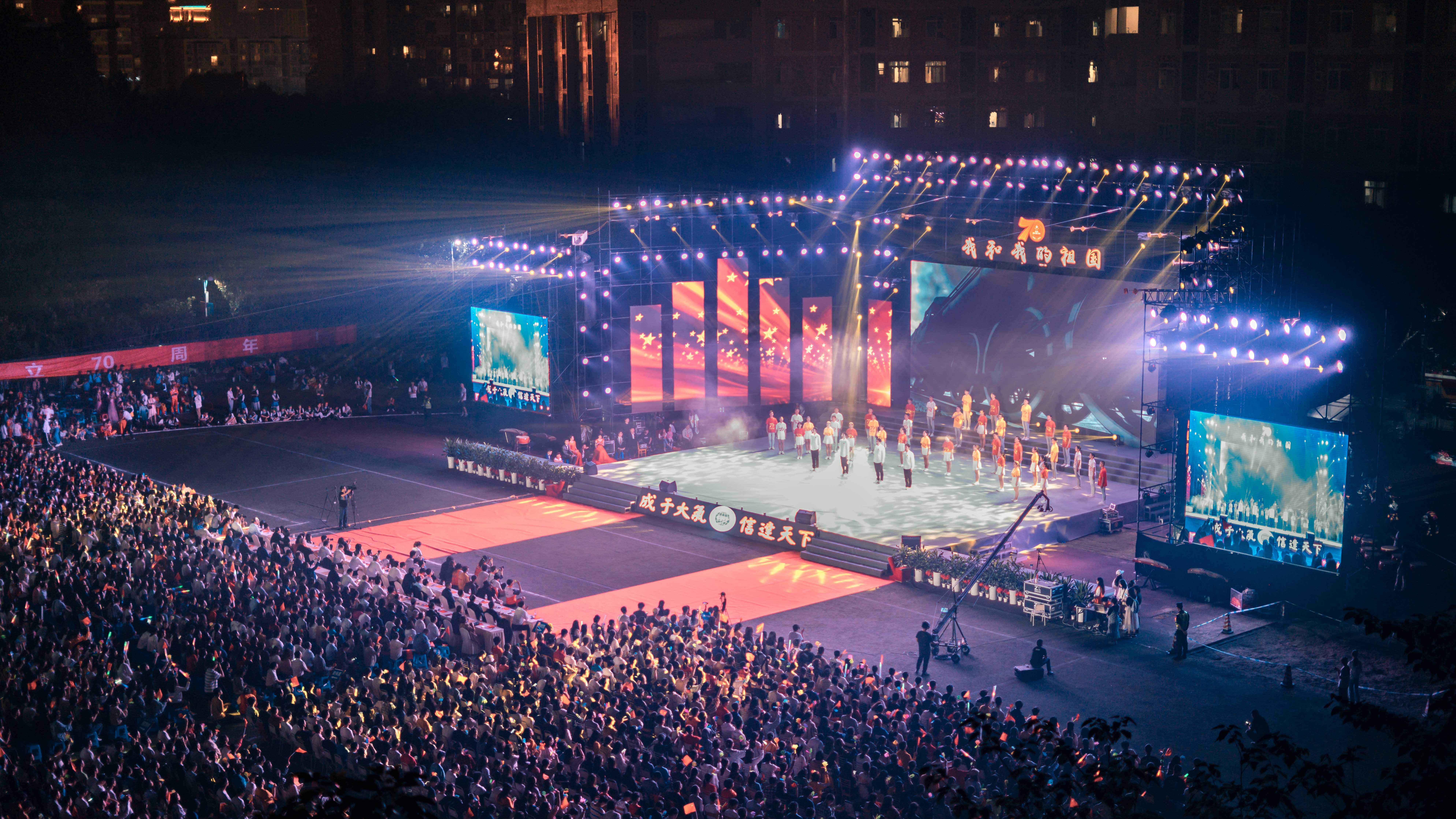 20米长的五星红旗在万人间传递将晚会推向了最高潮,全体师生共唱《我和我的祖国》,祝福伟大的祖国繁荣昌盛,祝愿成信人携手并进,再谱华章。师生们热情地挥动手中的国旗,共庆新中国70华诞,晚会在《歌唱祖国》中圆满结束。