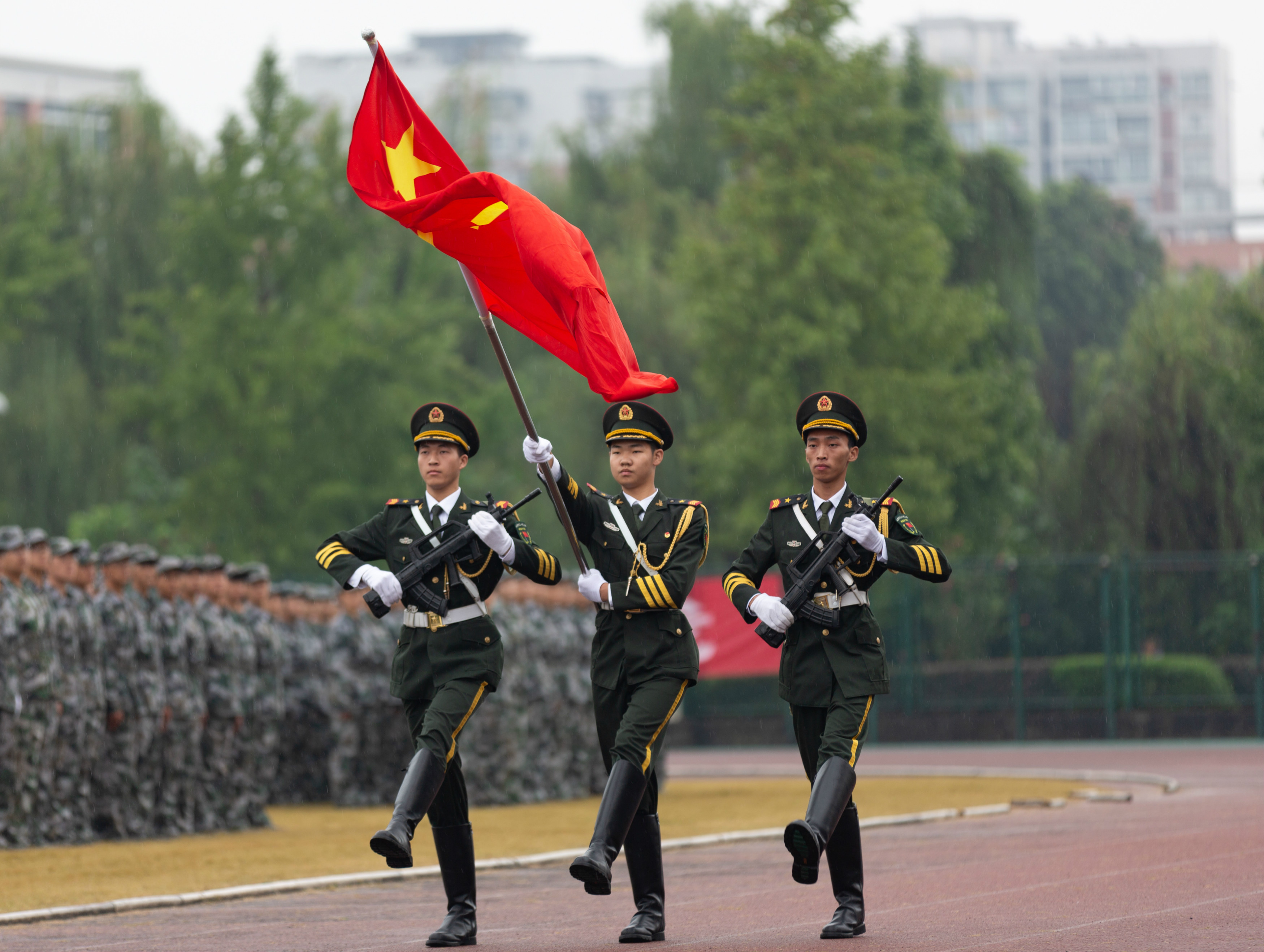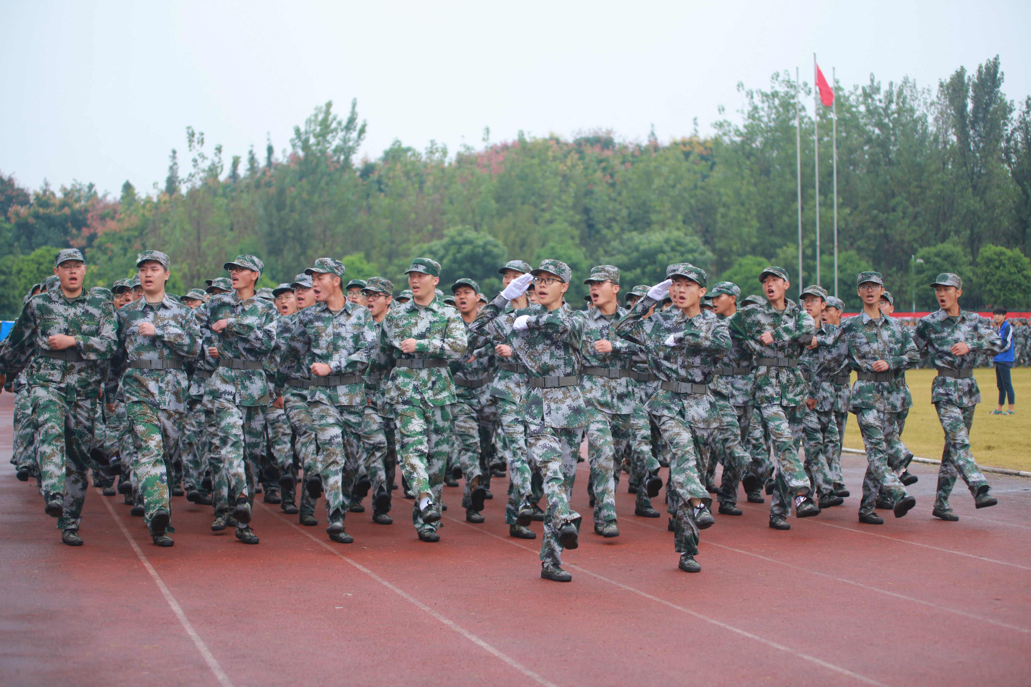 现场举行了庄严的升国旗仪式。伴随着雄壮的国歌声,2019级参训新生们身着迷彩服,向着冉冉升起的国旗行注目礼。