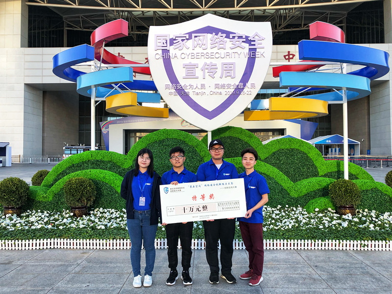 【本网讯】作为2019年国家网络安全宣传周重要活动之一,由天津市委网信办、中国网络空间安全协会、滨海新区政府主办,南开大学、天津大学、天津理工大学承办的第五空间网络安全创新能力大赛决赛9月18日在天津梅江会展中心举行。我校网络空间安全学院 “道格安全小组”成员彭玉轩、康浩荣、曾春浩、周晓燕四名同学组成的参赛队伍取得“创新应用大赛”全国总决赛特等奖,奖金10万元。