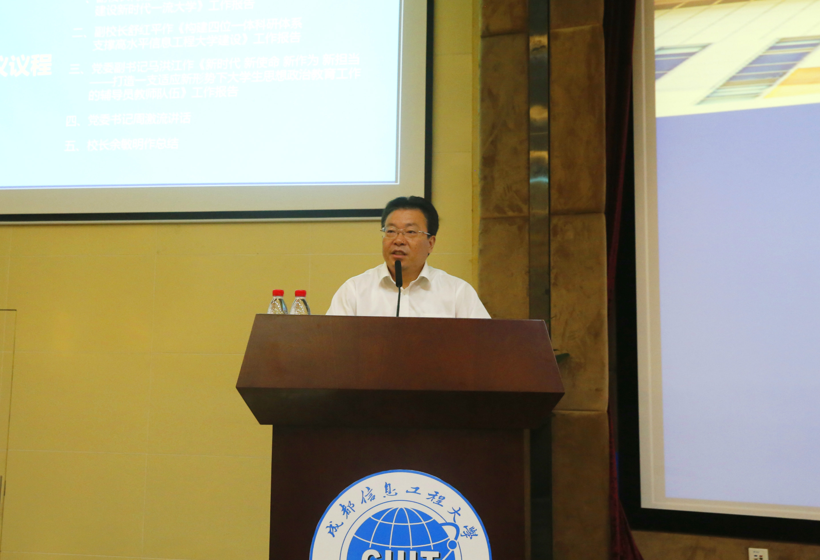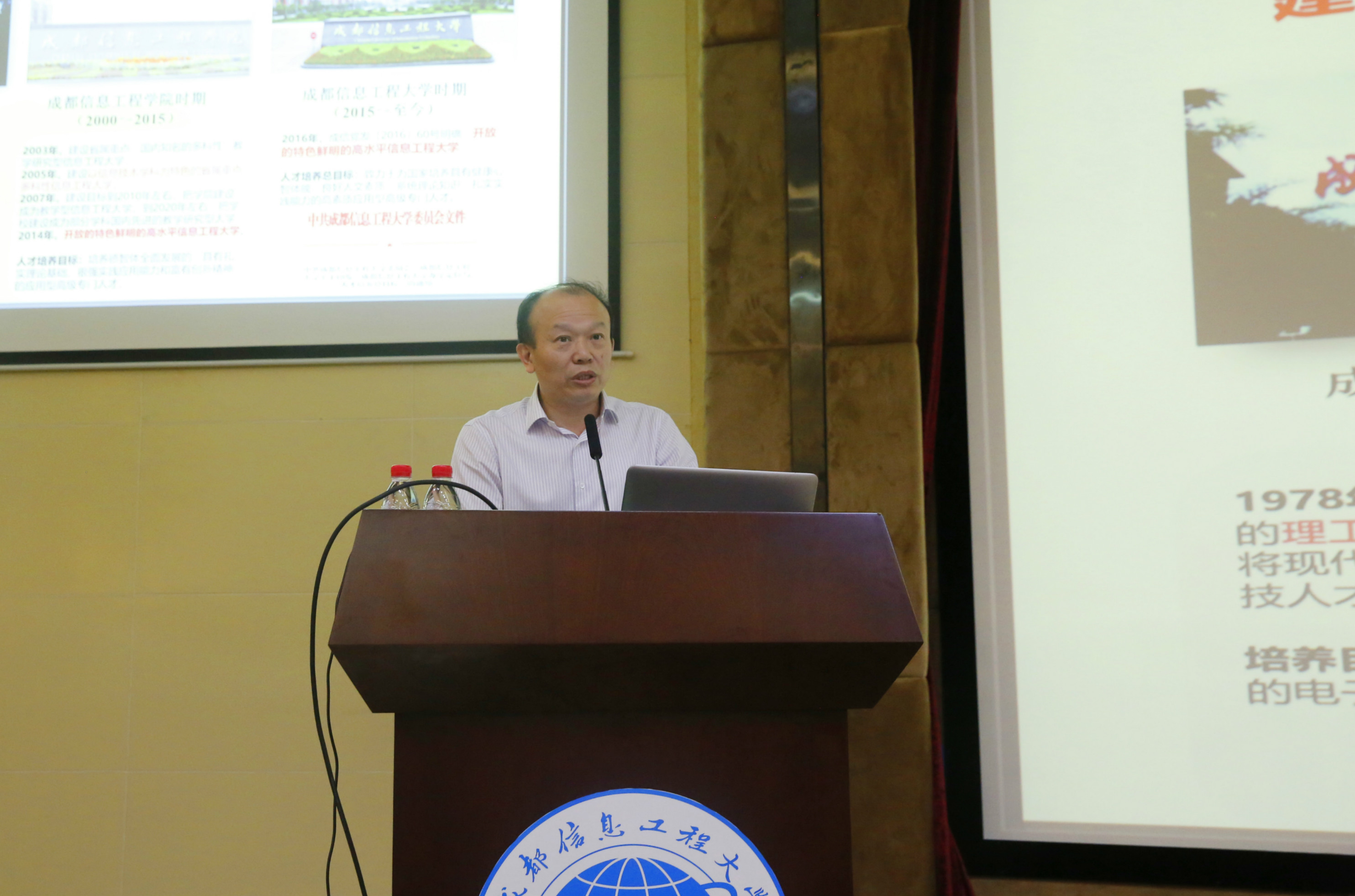 副校长何建新作了《不忘初心 砥砺奋进 建设新时代一流大学》的工作报告。何建新从“开放的特色鲜明的高水平信息工程大学”的目标及内涵分析入手,结合实例和统计数据,从开放合作交流、鲜明办学特色、高水平人才培养三个维度系统回顾了学校在学科、专业、课程建设方面取得的成就,深入分析了存在的不足,提出了以新时代“一流学科、一流专业、一流课程”建设为指引,以“一流学院”建设为基础,加强博士点建设,做好专业建设规划,强化质量保障体系运行,夯实培养基础的“一流大学”建设思路和措施。