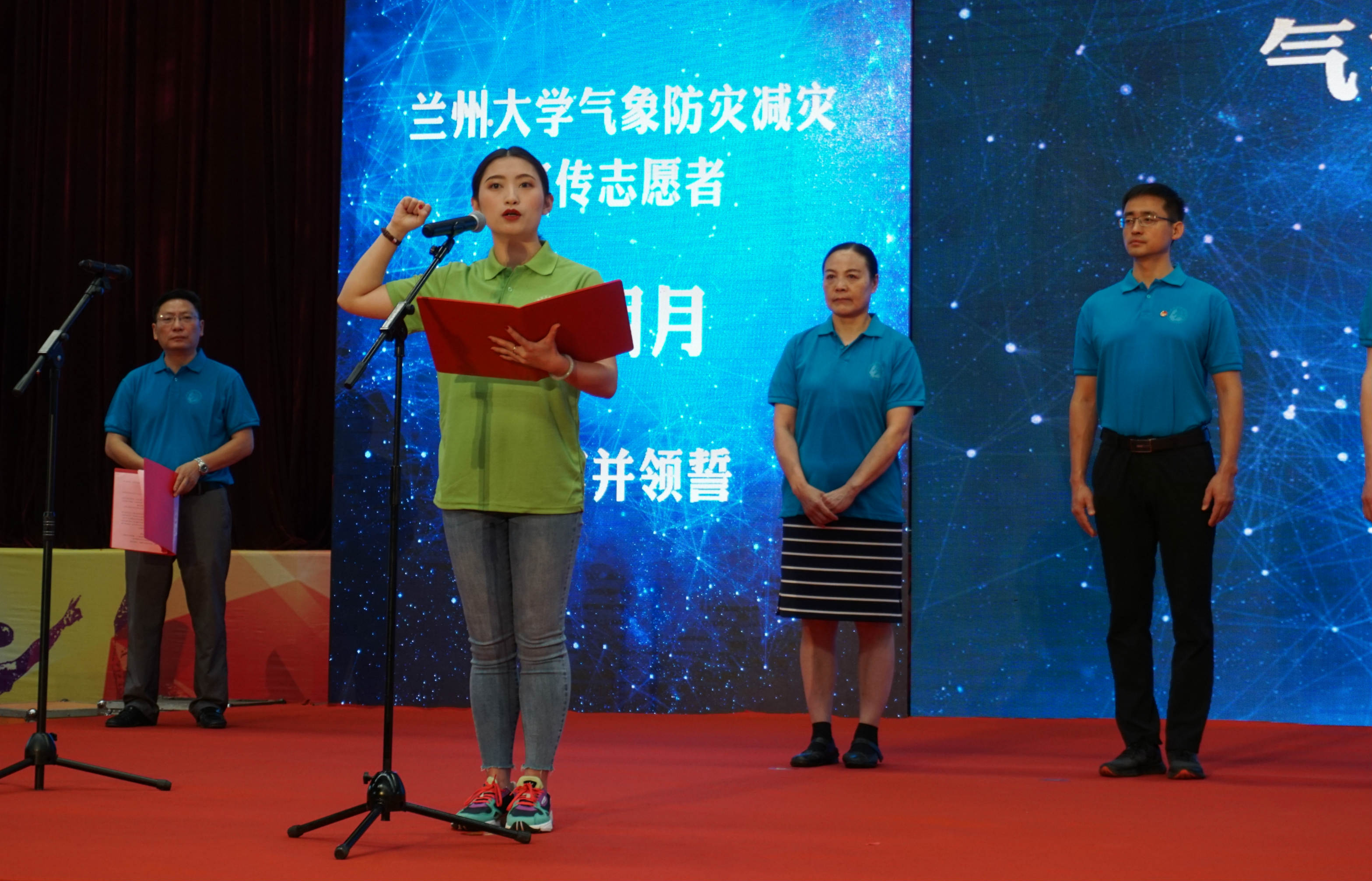 兰州大学学生马明月代表志愿者发言并领誓。她分享了自己连续五年参加“气象防灾减灾宣传志愿者中国行”活动的经历和体会,代表所有气象防灾减灾宣传志愿者表达了对活动的主办、承办、协办单位以及所有关心帮助志愿者的人们的感谢,并带领志愿者庄严宣誓,将尽己所能,不计报酬,帮助他人,协同合作,践行志愿精神,传播先进文化,为建设团结互助、平等友爱、共同前进的美好社会贡献力量。