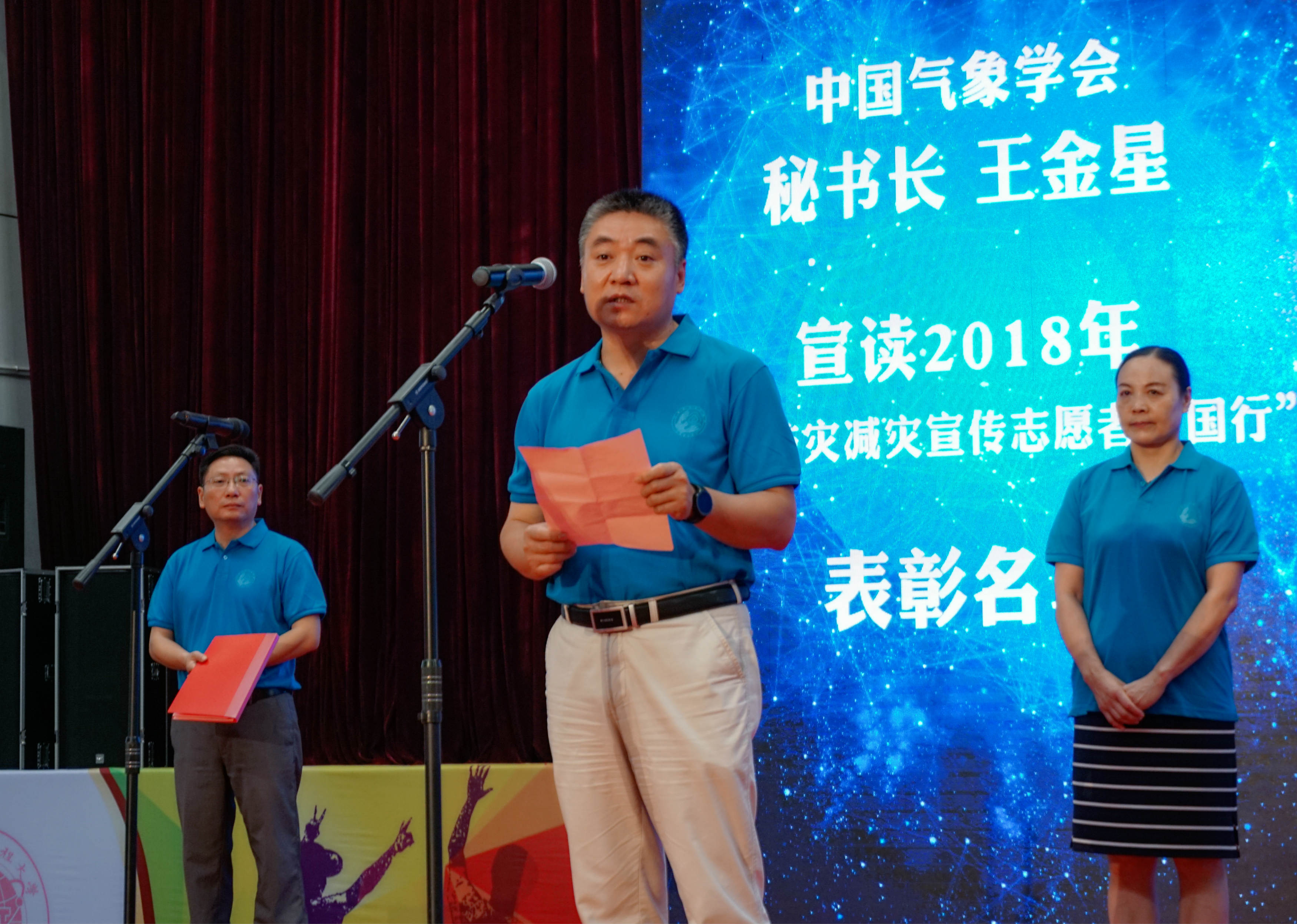 王金星宣读了2018年“气象防灾减灾宣传志愿者中国行”活动评优表彰名单。三亿网—成都A队、东北农业大学—中国气象行团队、四川农业大学—将计就计团队、兰州大学—中国气象防灾减灾科普宣传队重庆分队等分别获得2018年“气象防灾减灾宣传志愿者中国行”活动最佳报告奖、最佳文字记录奖、最佳影像记录奖、最佳创意奖和一二三等奖团队等奖项。三亿网、南京信息工程大学、兰州大学、东北农业大学、四川农业大学获得优秀组织单位荣誉。参会领导为获奖团队和优秀组织单位颁奖。