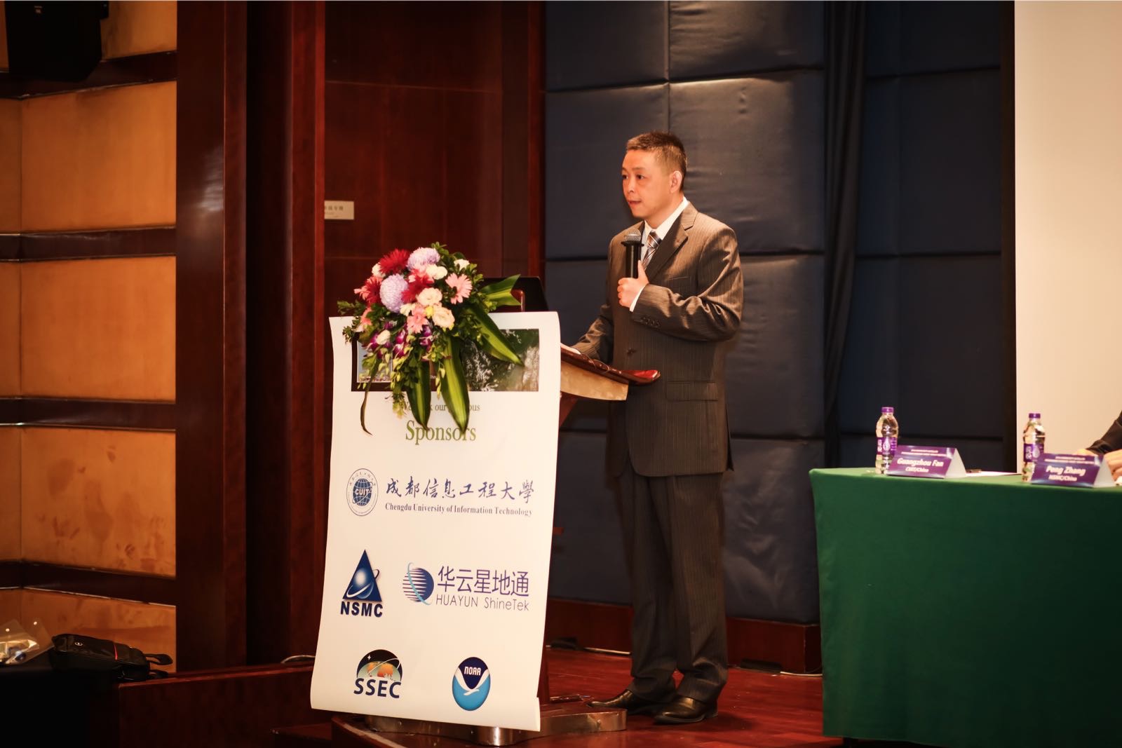 学校副校长范广洲,国家卫星气象中心副主任张鹏,美国国家海洋和大气管理局(NOAA)Mitch Goldberg研究员,美国威斯康辛大学麦迪逊分校空间科学与工程中心AllenHuang研究员参加开幕式并致辞。