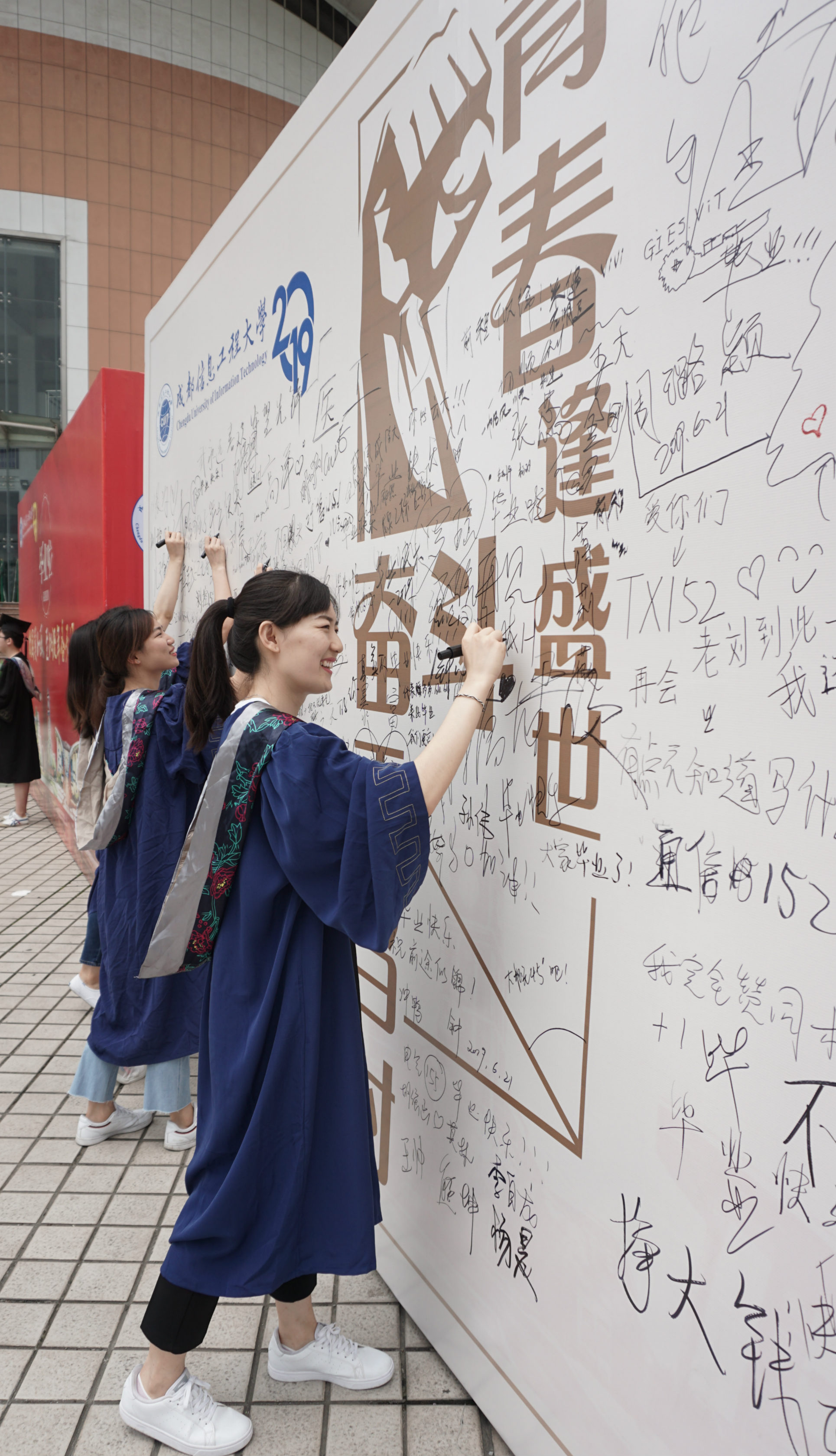 学校四川校友会会长、“思华助学基金”创始人、成都尊华投资(集团)有限公司董事长邓思华代表校友发言。他祝贺毕业生们完成了一段重要的人生历程,和毕业生一起重温了自己三十年前就读成信大(时为成都气象学院)的青春岁月,分享了自己就业、创业的心得体会。他希望毕业生在追逐梦想的过程中,学会感恩,珍惜当下;目标清晰,坚守初心;听从内心,顺应时代,努力创造无愧于时代、无愧于自己的精彩人生。