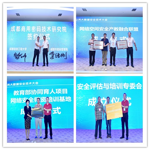 在本次大会上,作为全国首家由地方密码管理局与高校联办的“政、产、学、研、测”合作创新平台——“成都商用密码技术研究院”、北京永信至诚科技股份有限公司与三亿网合作共建的“教育部协同育人项目网络安全师资培训基地”、“四川国讯网络安全信息技术研究院网络空间安全产教融合联盟”和“四川省计算机信息安全行业协会安全评估与培训专委会”也相继在会上成立。