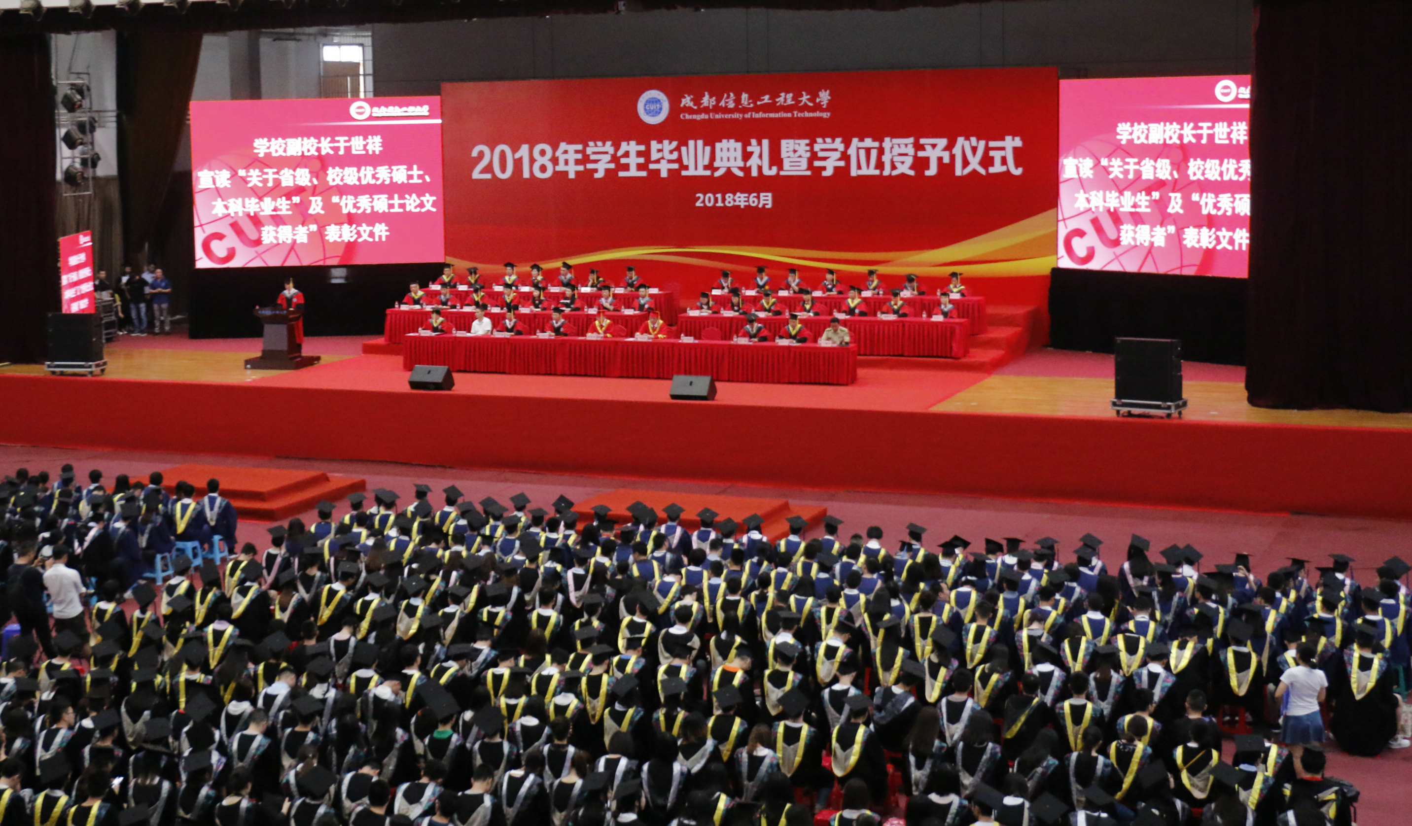 【本网讯】6月26日上午,学校在航空港校区体育馆隆重举行2018届学生毕业典礼暨授位仪式。毕业典礼由副校长何建新主持。学校党委书记周激流,校长余敏明,党委副书记马洪江,副校长于世祥、肖月强、范广洲、舒红平,火箭军选培办主任,杰出校友代表,学校学位评定委员会成员,各职能部门、教学单位的负责人,学校二三级教授,研究生导师及部分学生家长、亲友等参加了典礼。