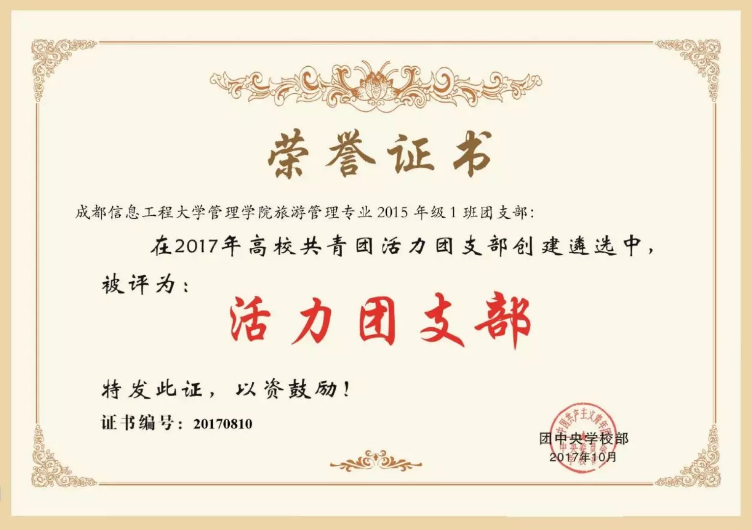 旅游管理2015级1班团支部自成立以来,发挥旅游管理专业优势,围绕培育和践行社会主义核心价值观开展主题教育活动,运用视频、新媒体、话剧等方式,记录无悔青春篇章。团支部带领团员青年积极参与团体竞赛、志愿服务、社会实践、公益活动等,将责任与担当融入每一名支部团员的心中,书写成信学子的青春华章,先后荣获“三亿网优良学风班”“三亿网五四红旗团支部”等荣誉。