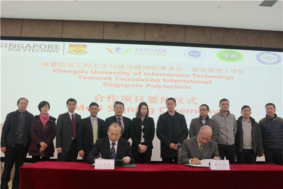 淡马锡国际基金会项目合作高级主管Stanley Lee、淡马锡国际基金会公关经理Tan Junming、新加坡理工学院国际关系事务部主任Lee Leck Seng、新加坡理工学院副总经理Chia Hui Yong,四川省教育厅、电子科技大学成都学院、西华大学、成都东软学院的领导以及我校相关部门负责人等参加了签约仪式。