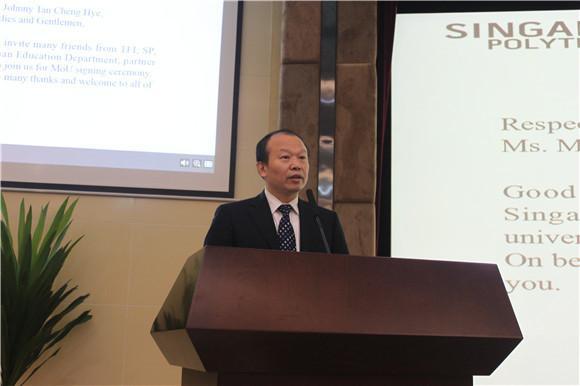 何建新对参加签约仪式的嘉宾表示诚挚的感谢和热烈的欢迎,并介绍了我校在工程教育改革方面所做出的努力和取得的成绩。自2015年起,我校与新加坡理工学院进行了多次商讨及互访,以确保CDIO教师培训项目顺利开展。该项目是淡马锡国际基金会在中国资助的第一个项目,我校作为主办方,联合电子科技大学成都学院、西华大学和成都东软学院的共同开展,约120名教师参与项目,希望通过该项目能让更多的老师将此套教学法应用到实际教学中,让学生受益,同时也为四川省的工程教育作出更多的贡献。