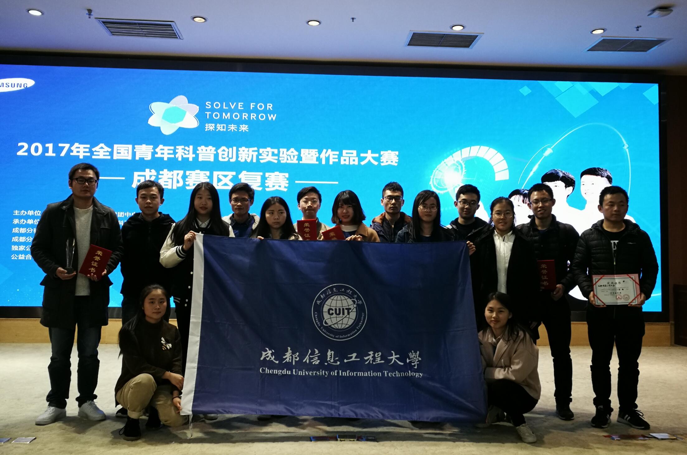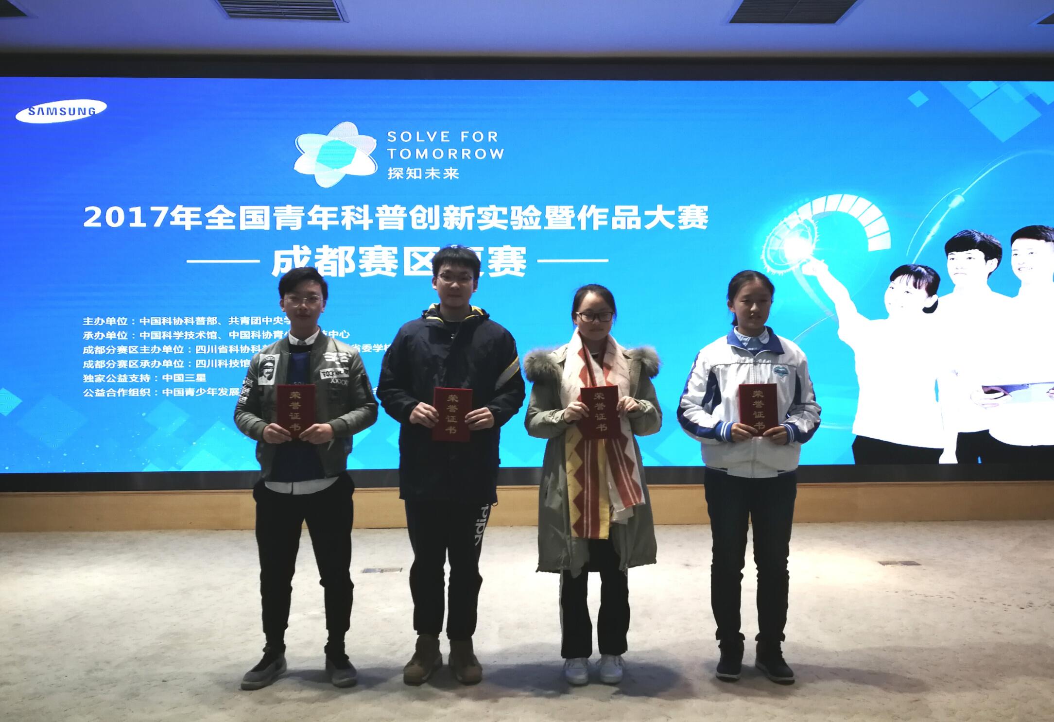 【本网讯】12月10日,由四川省科协科普部、共青团四川省委学校部主办,四川科技馆承办的“探知未来”2017年全国青年科普创新实验暨作品大赛(成都赛区)复赛在四川科技馆隆重举行。经过激烈角逐,我校5支参赛学生团队发挥出色,在“创意作品单元(未来教育)”竞赛中斩获一等奖1项、二等奖1项、三等奖1项、优秀奖2项。由于在大赛组织工作中表现突出,我校被团中央学校部、中国科协科普部授予优秀组织奖,厉威成被评为优秀指导老师。