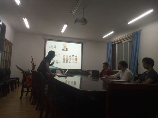 文化艺术学院教师刘洁带领三位外籍专家开展了一场趣味汉语体验活动。刘洁生动有趣的教授了如何用汉语进行“自我介绍”:“你好,我叫……,我是……,我喜欢……”,通过老师风趣幽默地讲解和与中国学生的互动训练,外籍专家们已经能够“字正腔圆”的用汉语简单地作自己介绍。在活动中,刘洁还示范了汉字的书写过程,讲授了美丽而古老的汉字“故事”。