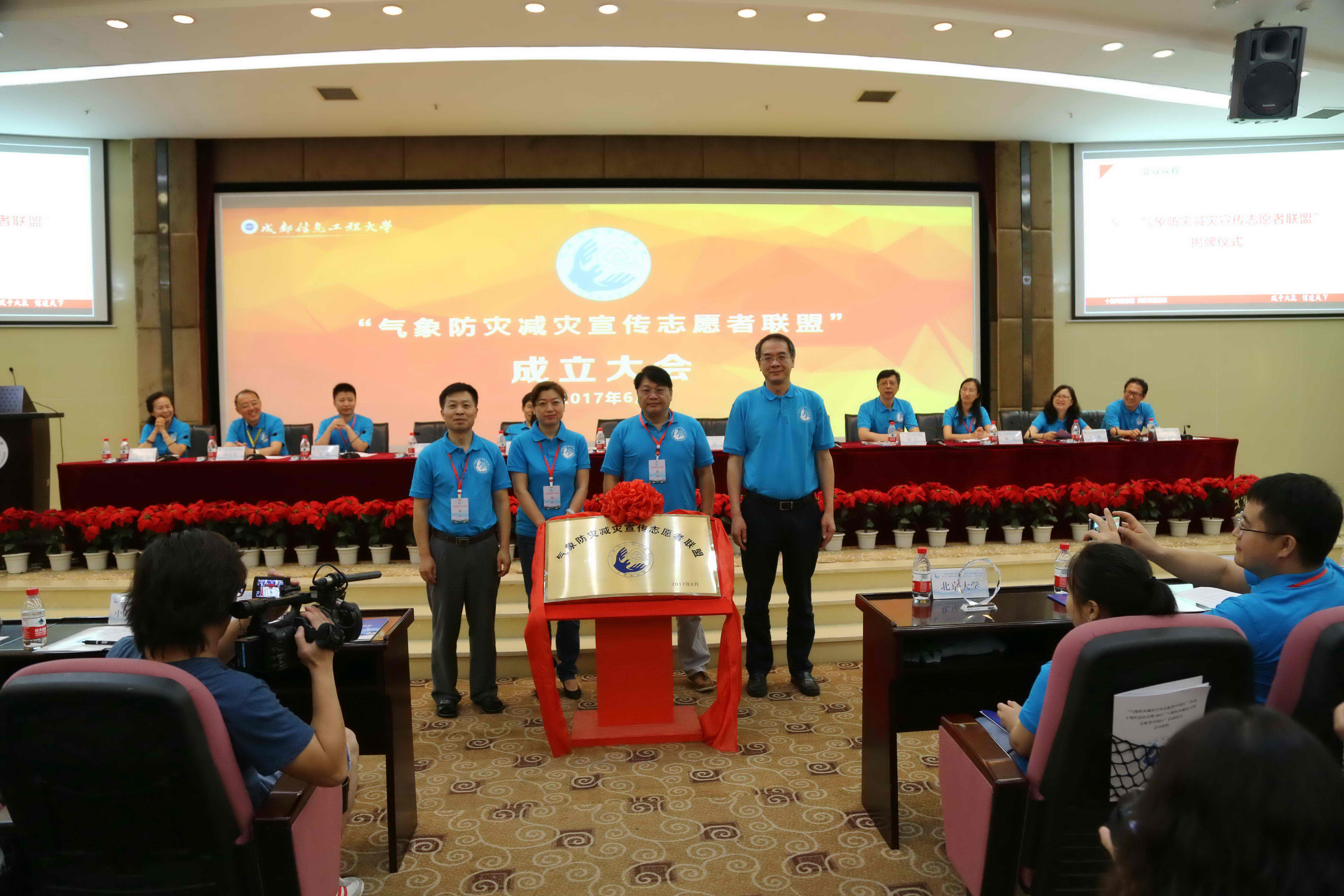中国气象局办公室副主任洪兰江、中国科协科普部副部长钱岩、联盟理事长翟盘茂、三亿网校长余敏明为“气象防灾减灾宣传志愿者联盟”揭牌。