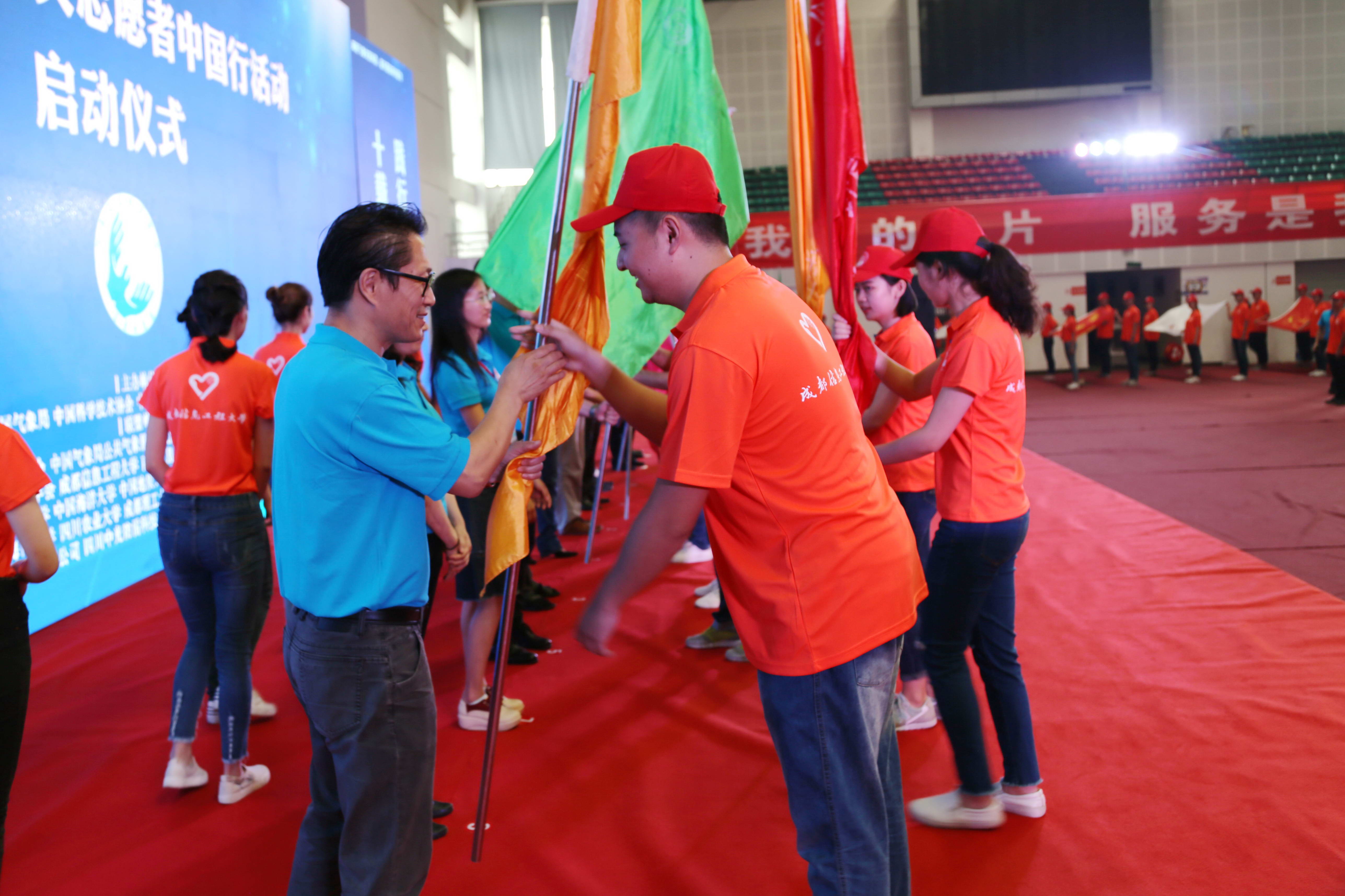 钱岩宣布“气象防灾减灾宣传志愿者中国行”活动正式启动。启动仪式现场,与会领导向各省志愿者代表授旗,我校大气科学学院学生李杨莲代表志愿者发言并领誓。