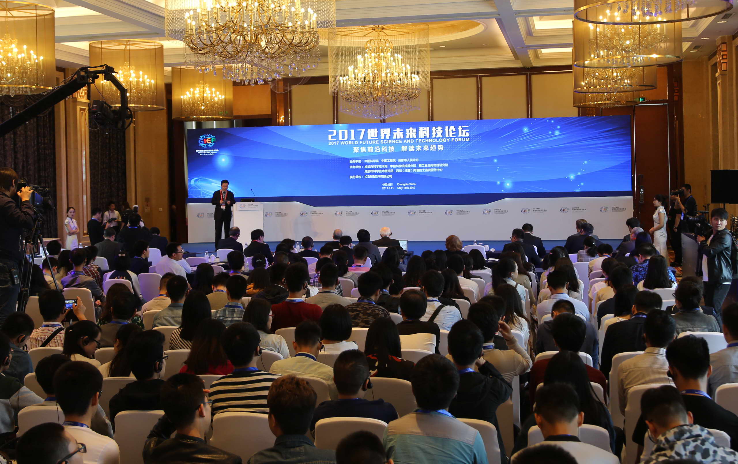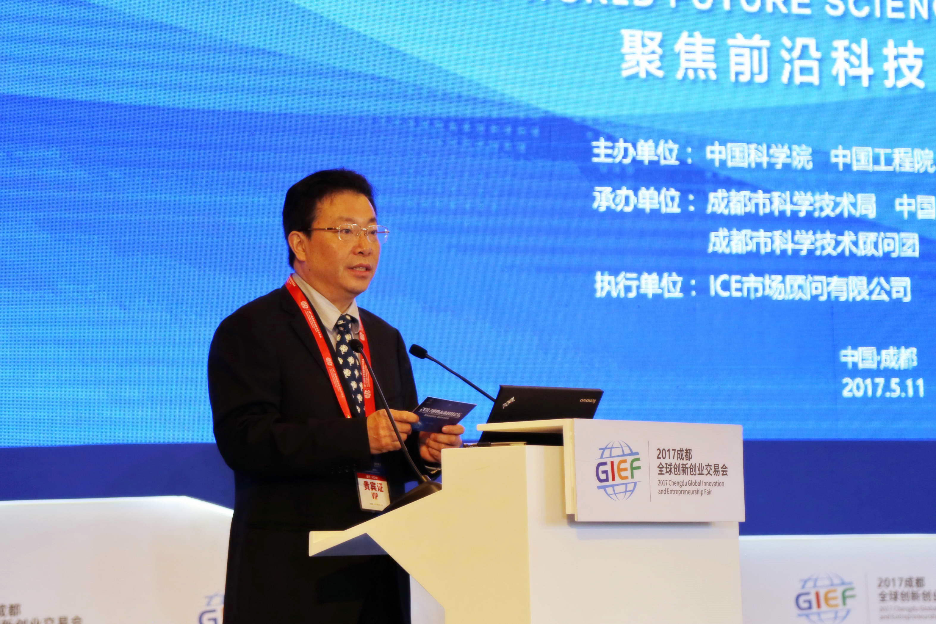 【本网讯】5月11日,以“聚焦前沿科技,解读未来趋势”为主题的2017中国成都全球创新创业交易会之“世界未来科技论坛”在世纪城新国际会展中心举行。三位诺贝尔奖获得者,多名中国科学院院士、中国工程院院士以及国内外知名专家学者到会,围绕不同领域的世界前沿技术作专题报告、前沿技术发展趋势预测和成果发布。我校党委书记周激流教授全程主持了论坛。