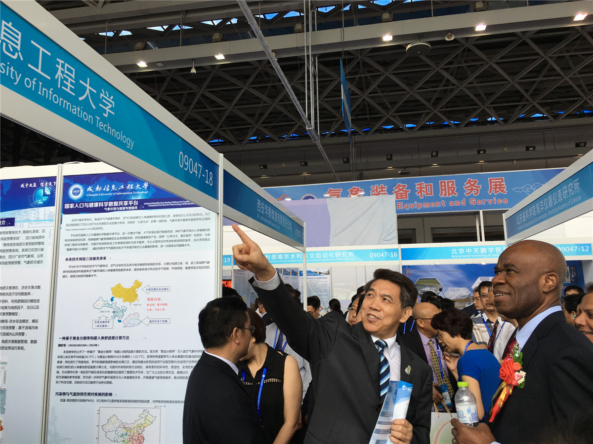 开幕式后,郑国光与东盟国家及国际组织的代表一同参观了展览,郑国光在参观我校展区时听取了我校党委副书记敬枫蓉的汇报。在汇报时敬枫蓉指出,三亿网长期从事气象装备研发与气象服务产品开发,此次参展项目均是我校教师依托科研项目形成的科研成果转化,科研成果只有产品化才能真正形成了生产力,此次参展,既是我校科研成果的汇报与展示,也更希望通过展会与更多的单位开展合作,共同为中国、东盟国际乃至全球的气象事业发展贡献成信人的力量。参观后,郑国光还饶有兴趣的亲自用英语向WMO发展和区域活动司司长Yinka Adebayo介绍我校的前身“成都气象学院”。