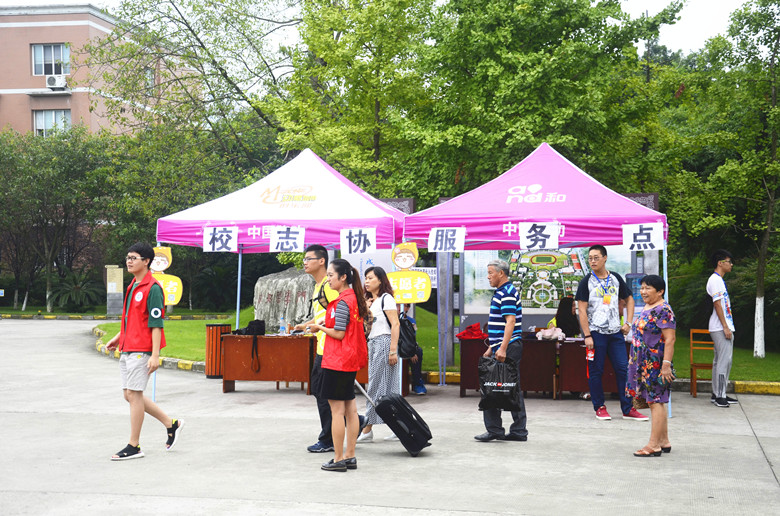从校大门到体育馆,彩旗飘扬,指示路牌简明醒目;学长学姐们原创的迎新招贴营造出喜庆、温馨的氛围;青年志愿者在沿途服务点为新同学及家长提供各种帮助和服务。