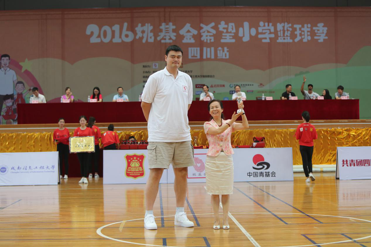 在颁奖环节,姚明先生为为我校颁发了“姚基金希望小学篮球季·特殊贡献奖”,敬枫蓉作为我校代表领取了奖杯。