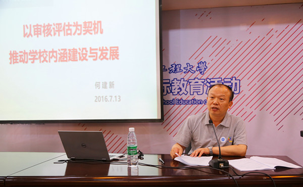 副校长何建新作了“以审核评估为契机,推动学校内涵建设与发展”的工作报告,回顾了审核评估工作开展以来我校取得的六个方面阶段性成效:一是厘清了人才培养中存在问题,明确了本科教学建设方向;二是强化了人才培养中心地位,确立本科教学优先地位;三是多措并举,加速师资队伍建设;四是规范教学管理,加强教学基本建设;五是加强学风建设,提升学生服务水平;六是完善教学质量保障体系,加强教学质量监控。何建新提出了教学工作中丞待解决的问题,并强调应从增强全员服务教学意识,强化人才培养中心地位;加强教风、师德师风建设,提升教师综合素质;完善自我评估制度,健全质量保障体系;加强国际合作与交流,提升教师国际化水平;调整工作状态,认真完成本科教学工作审核评估工作等方面全面推动学校内涵建设与发展。