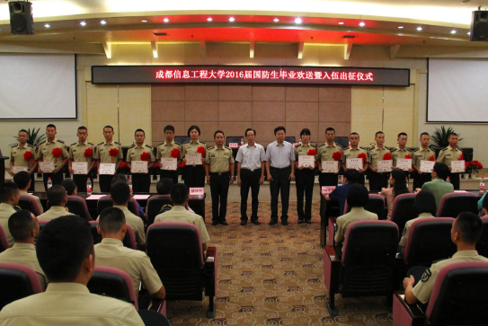 【本网讯】7月4日上午,我校2016届毕业国防生欢送暨入伍出征仪式在国际会议厅成功举办。学校党委书记赖廷谦、校长周激流、副校长于世祥,相关职能部门负责人,毕业年级国防生培养学院党总支书记、副书记,驻校选培办、学生工作处相关人员、2016届毕业国防生及在校国防生代表参加了出征仪式。仪式由王主任主持。