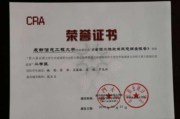 我校学生姚儒、张荣、苏越、吴露敏、罗龙洲在领队和技术指导教师丛日玉的带领下,历经网上知识考试、校内比赛选拔、西南分赛区选拔、专家网上评审等多个环节比赛,从整个西南分赛区中脱颖而出,最终凭借策划、调查实施、数据处理与分析等专业实战能力打入全国总决赛,获得全国二等奖的优异成绩。同时,学校荣获“最佳院校组织奖”。