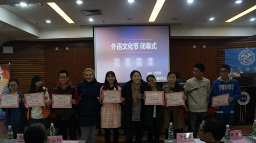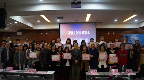 为活跃闭幕式气氛,大会安排了精彩的节目。缪怡然同学为大家带来了“英美文化”演讲;于姝宁、郭小侨同学献上了悦耳的英文歌曲,文化艺术学院再次演绎了英语原声电影配音的视听享受;罗旭辉同学的一曲《 Apologize》的优美歌声引来台下观众的阵阵欢呼。闭幕式上出席闭幕式的嘉宾为获得本届外语文化节的获奖者颁发了一、二、三等奖和优秀奖。最后,外国语学院黄驰副院长致闭幕词并宣布本次外语文化节闭幕。(来源;外国语学院  作者:刘鋆  审核:新闻中心)