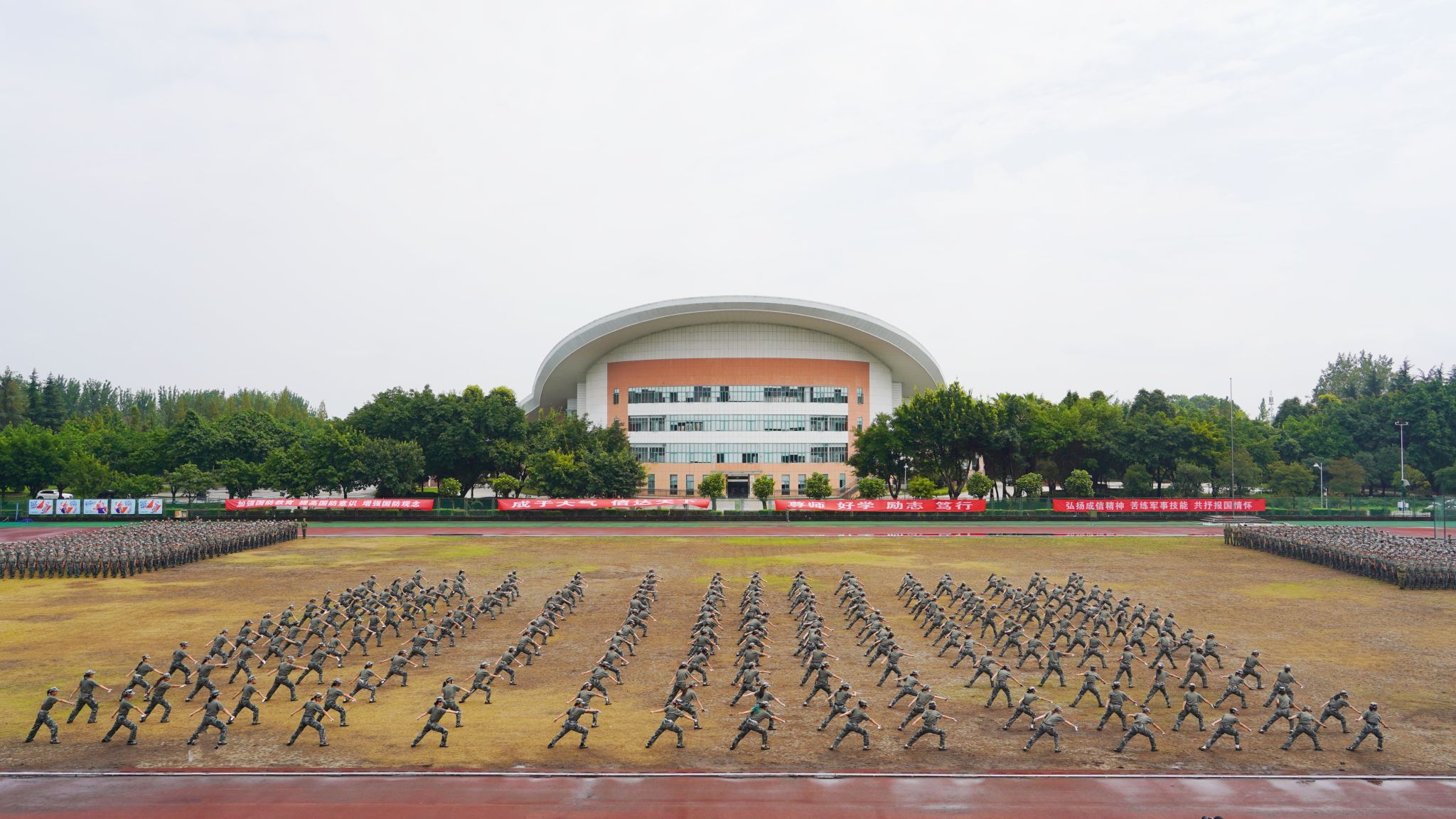 匕首操方队虎虎生威、巾帼不让须眉;军体拳方队整齐划一,酷飒中带着自信,豪迈中带着坚韧;花式方阵栩栩如生地摆出了战斗机造型,展示了学子们敢于创新,力争上游的精神面貌。同学行云流水地变换队列,展示出中国地图和“中国”“强国有我”等美观大气的队形,表达成信学子对祖国的热爱以及锐意进取、追求卓越的精神风貌。