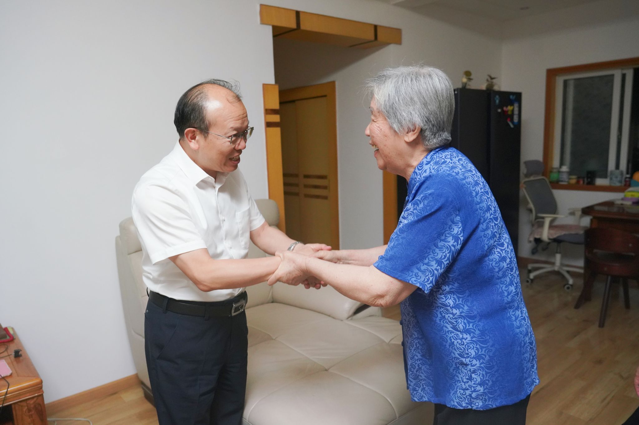 何建新到养老院和老同志家中,走访慰问了霍德棣、祝静敏、卫素贞、李祯贤等离退休老干部、老党员教师,与老同志们亲切交谈,详细了解了老同志们的饮食起居、日常护理和健康状况,询问了生活中的实际困难。他表示,学校如今各项事业取得的长足发展,源于老前辈们不懈奋斗和无私奉献打下的坚实基础,衷心感谢老前辈们长久以来对学校的大力支持和关心,为学校改革发展贡献的智慧和力量。他祝愿老同志们健康长寿、生活愉快、家庭幸福。老干部、老党员们深情回忆了在学校工作、与党同心同行的奋斗经历,感谢学校长期以来的关心和照顾,由衷地为学校跨越式发展感到骄傲,表示将一如既往地关注学校各项工作,尽其所能为学校的发展建设建言献策。