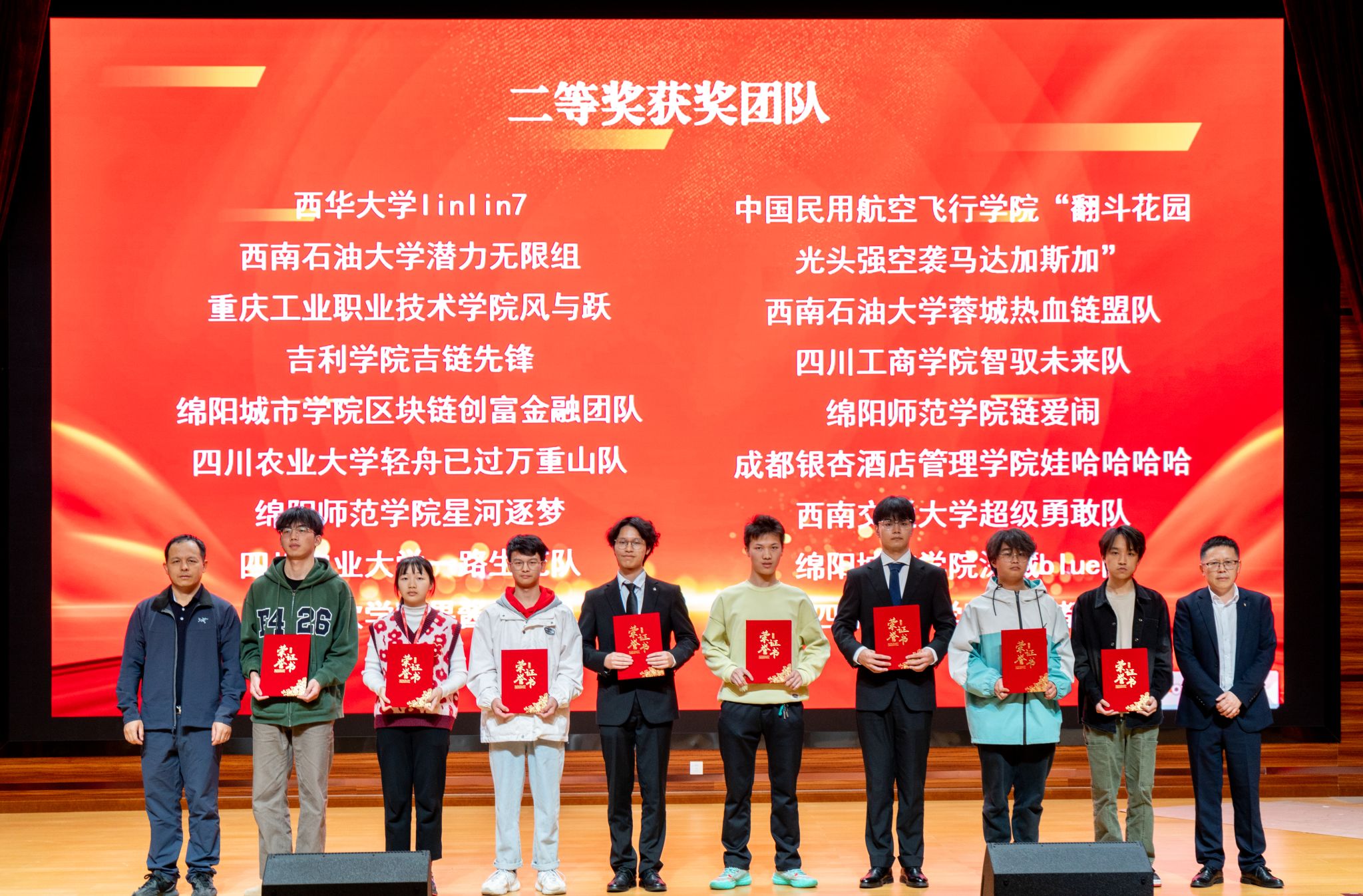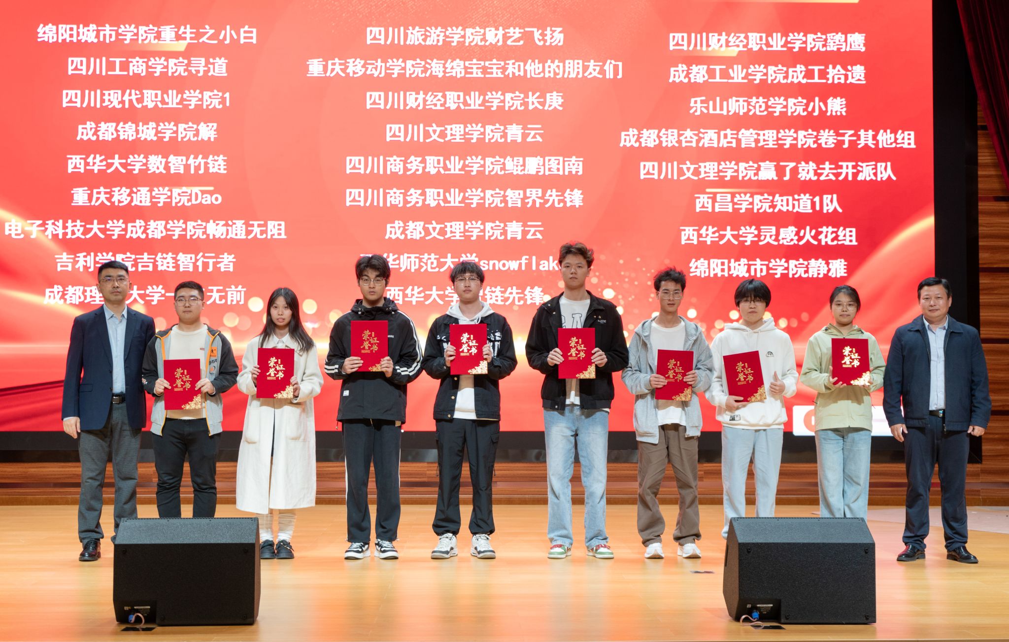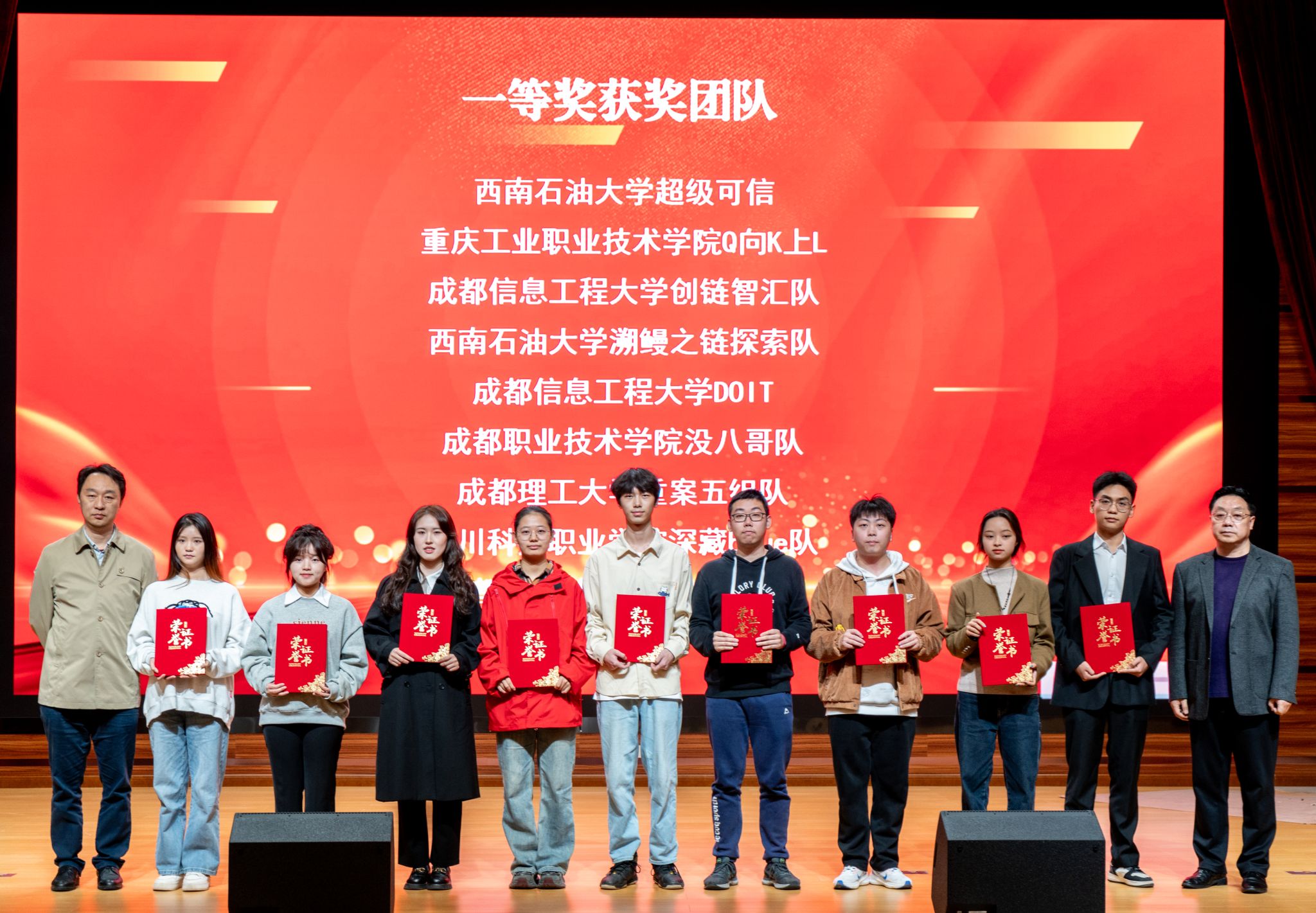人工智能学院(区块链产业学院)党委副书记姜宇忠代表大赛组委会宣读了本次大赛各奖项名单。通过初赛、复赛和决赛的激烈比拼,共有9支队伍获得省级一等奖,其中专业技术组3支队伍、行业应用组6支队伍,分别来自成都理工大学、西南石油大学、三亿网、重庆工业职业技术学院、成都职业技术学院、四川科技职业学院。17支队伍获得省级二等奖,其中专业技术组5支队伍、行业应用组12支队伍,分别来自四川农业大学、西南交通大学、西华大学、绵阳师范学院、吉利学院等院校。26支队伍获得省级三等奖,其中专业技术组8支队伍、行业应用组18支队伍,分别来自成都理工大学、四川旅游学院、重庆移通学院、绵阳城市学院、四川工商学院、四川现代职业学院等院校。大赛还评选出了15名优秀指导老师。