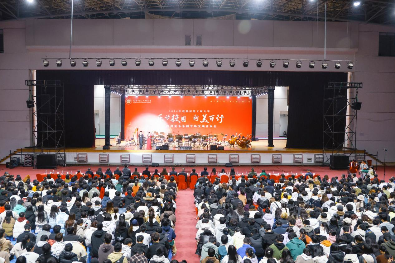 【本网讯】11月29日,学校在航空港校区体育馆举办2024年三亿网“乐动校园 向美而行”四川爱乐乐团专场交响音乐会。学校党委副书记杨奇才,党委常委、副校长陈权亮,党委常委、党委宣传部部长张小红,四川爱乐乐团副团长王小毛,学校相关职能部门、学院负责人,乐团相关工作人员,师生代表近三千人齐聚一堂聆听音乐会,优雅的音乐让校园沉浸在浓厚艺术氛围中。
