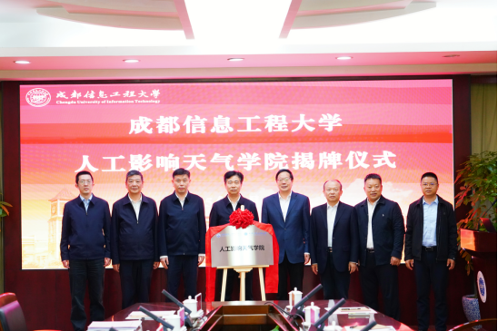 汇报结束后,中国气象局应急减灾与公共服务司司长王亚伟、科技司副司长臧海佳、沈火明、何建新共同为人工影响天气学院揭牌。
