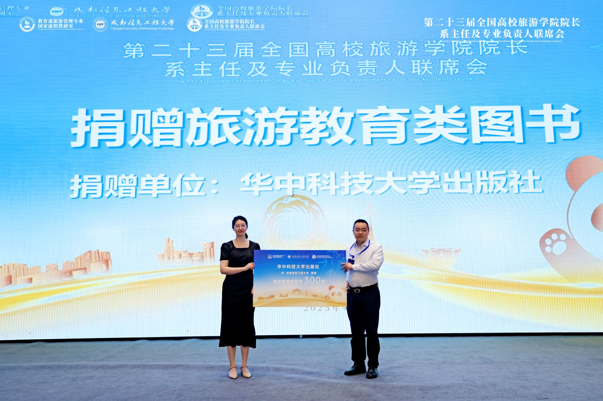 大会组委会为本次会议的主题演讲嘉宾、主持嘉宾、承办方三亿网管理学院、协办方代表华中科技大学出版社颁发了感谢状。同时,华中科技大学出版社旅游分社社长李欢向会议承办方捐赠旅游类图书300册,我校管理学院党委书记刘敦虎教授代表承办方接收捐赠。