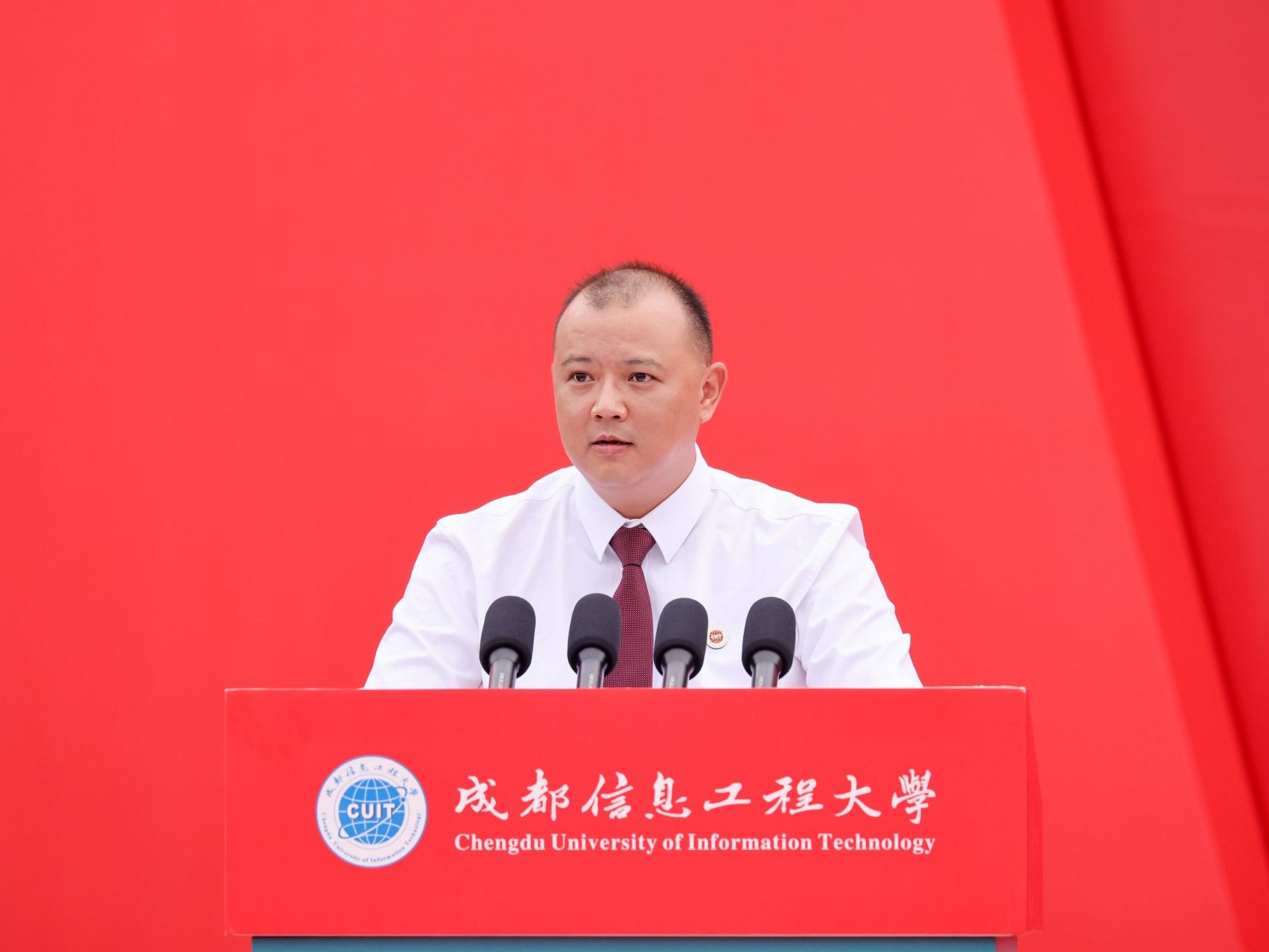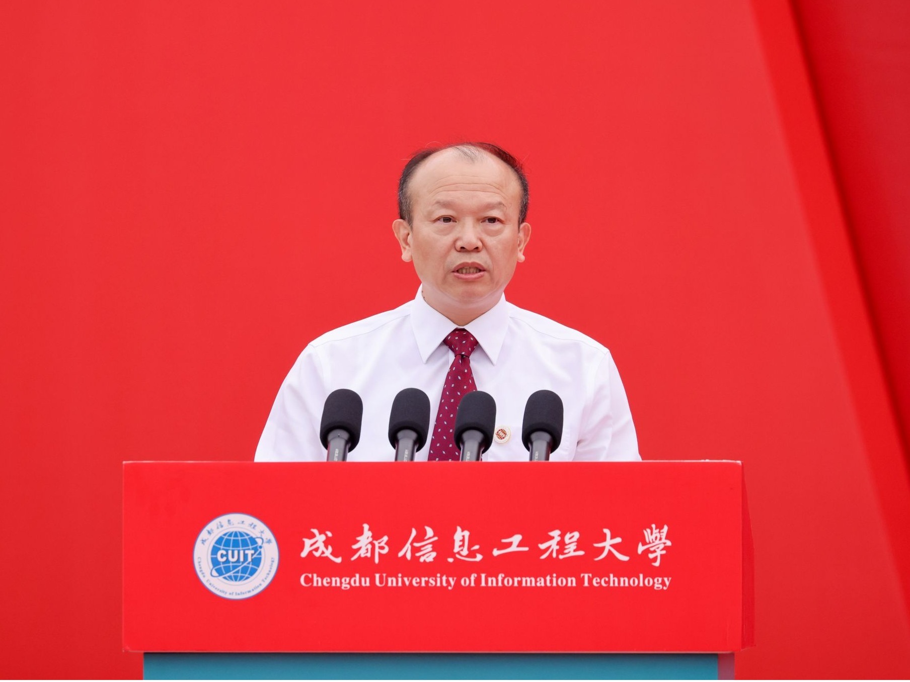 何建新向新同学表示热烈欢迎和诚挚祝贺。他指出,本届典礼因首批博士研究生的加入而具有特殊历史意义,标志着学校向“双一流”建设迈出更坚实的一步。他结合人工智能的时代背景,勉励全体学生以“智启未来,坚守本心”为行动指南,成长为兼具技术素养与人文精神的新时代建设者。学校成立人工智能学院,推动“AI+X”跨学科融合,助力学生掌握AI思维与原创力。同时,我们强调培养同理心、沟通力与批判性思维,坚守人文价值,让技术真正服务于人类福祉,闪耀人性光芒。他寄语新生,珍视多元成长机遇,永葆勤学笃行的奋进姿态;坚守求真立德初心,涵养仁爱诚信高尚品格;筑牢身心根基,厚植担当报国之志。他勉励大家秉承“成于大气,信达天下”的校训,做多元创新的成信人,在中华民族伟大复兴的征程中贡献青春智慧。