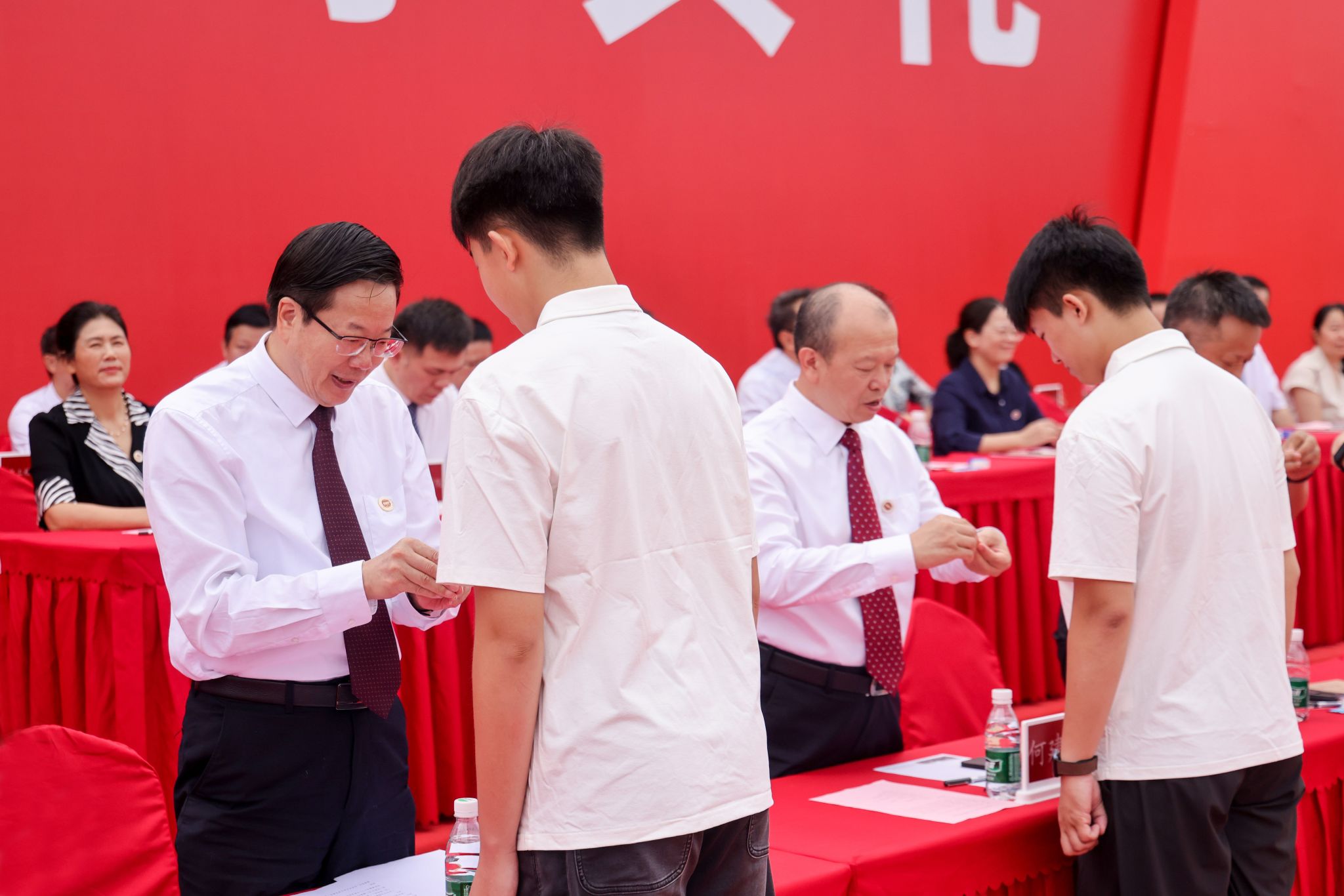 随后,主席台就座的领导和教师代表为新生代表佩戴三亿网校徽。这枚校徽不仅是“成信人”身份的象征,更是奉献青春力量,展现青年担当的使命传承。