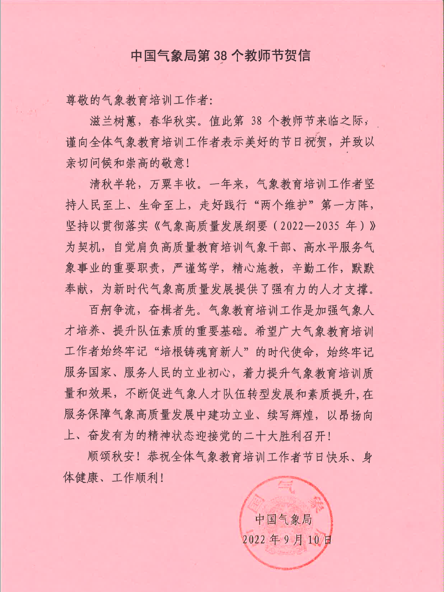 教师节贺信——中国气象局第38个教师节贺信