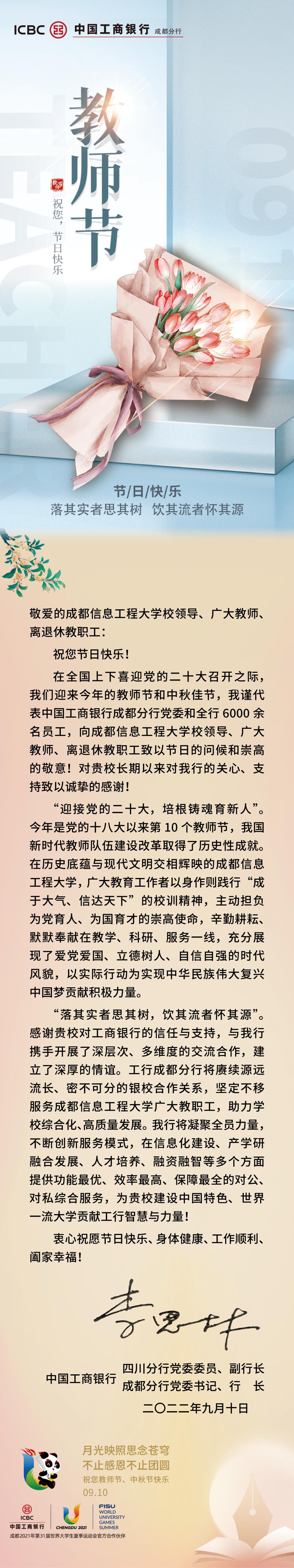 教师节贺信——中国工商银行致三亿网全体教职工