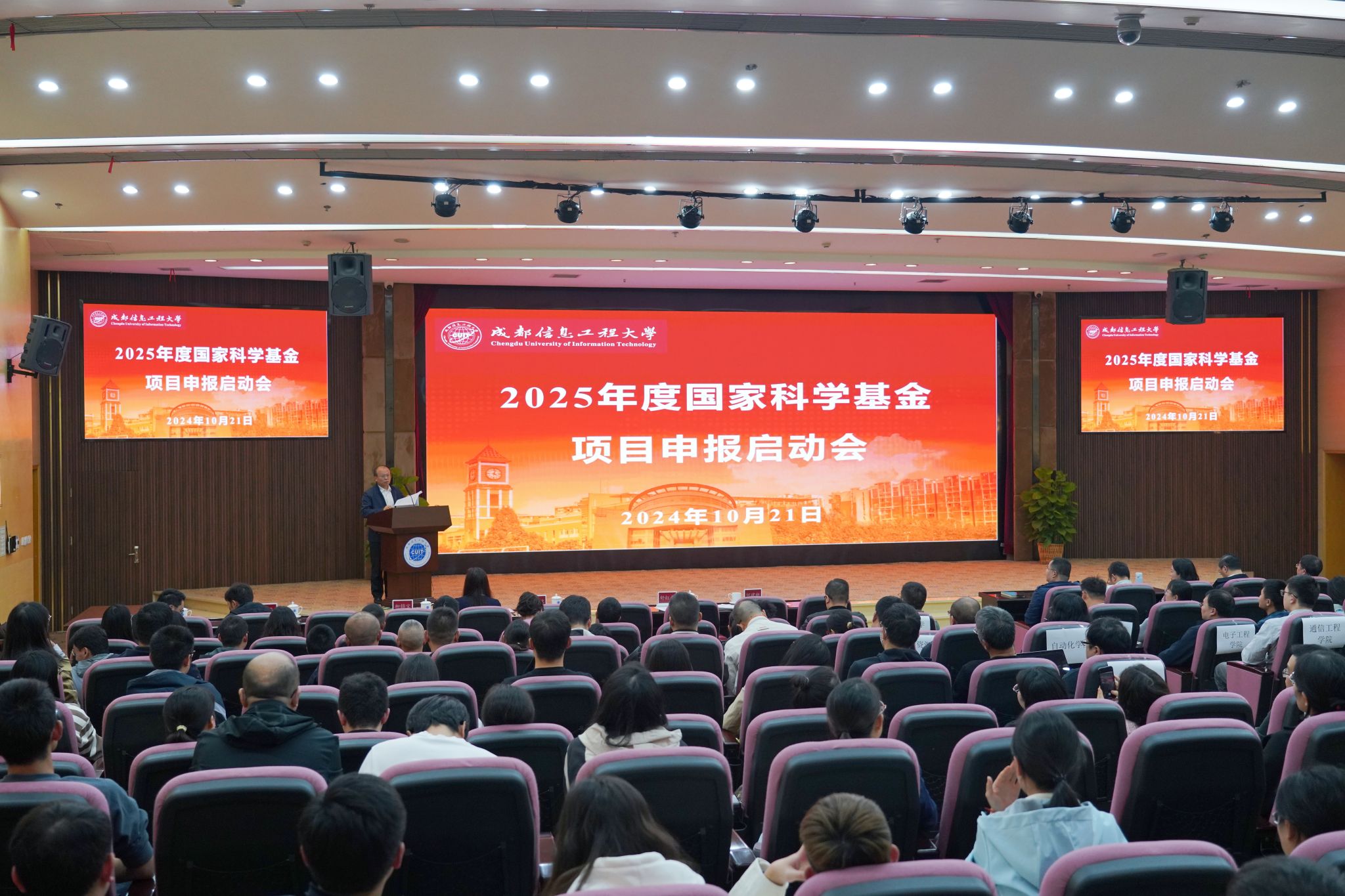 【本网讯】10月21日下午,2025年度国家科学基金项目申报启动会在航空港校区国际会议厅召开。学校校长何建新、副校长舒红平,科技处负责人,各学院院长、分管科研副院长、科技与研究生科科长、科研秘书、科研助理,近3年新进博士、副高以上职称教师、符合申报条件的教师共计330人参加会议。会议由科技处副处长李秋敏主持。
