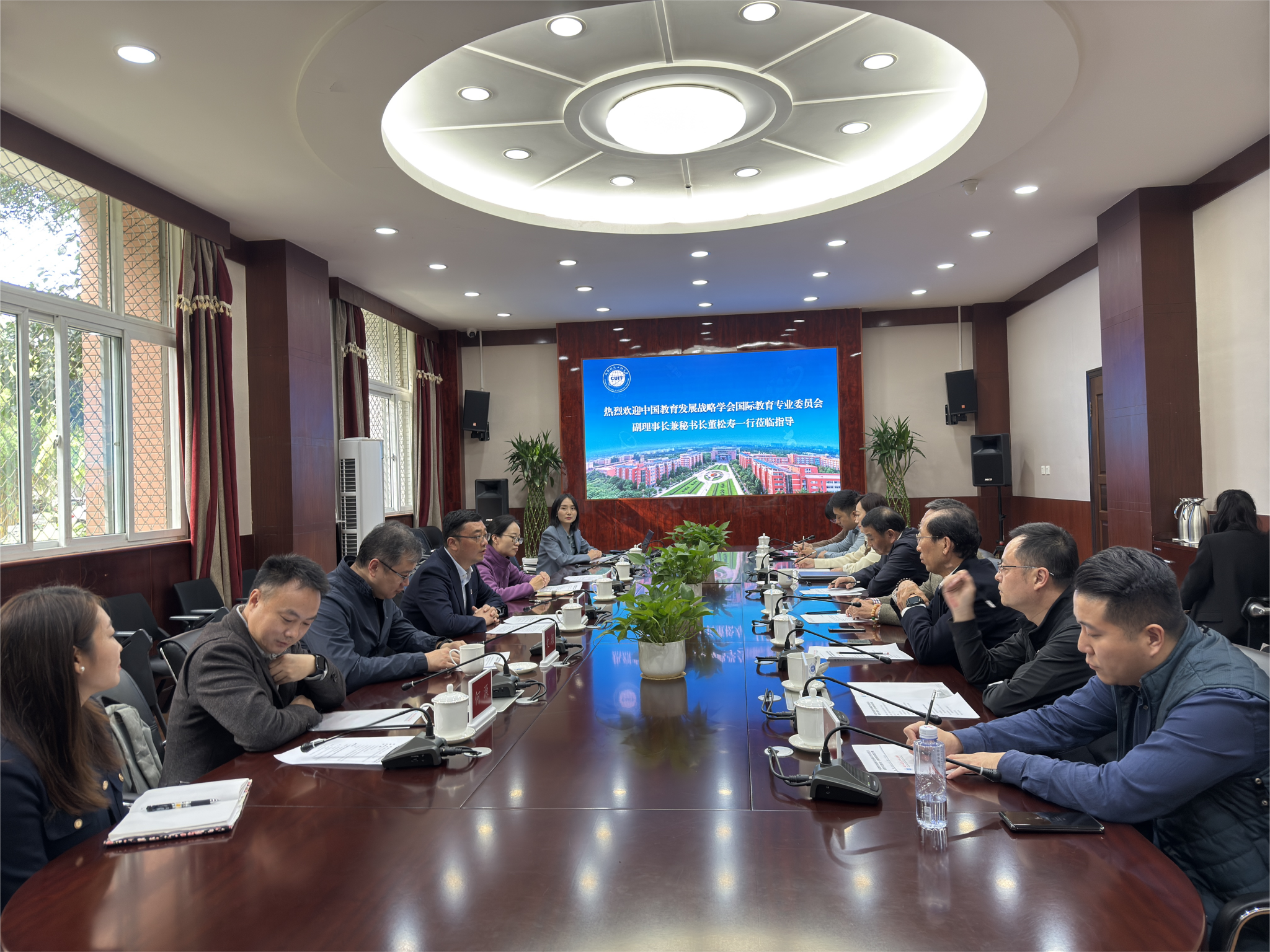 【本网讯】11月4日,中国教育发展战略学会常务理事兼国际教育专业委员会副理事长兼秘书长董松寿,副理事长罗平、徐培祥,北京英格立教育科技有限责任公司CEO沈融等一行来访,与学校副校长吴锡在航空港校区行政楼第六会议室交流座谈。国际交流与合作处、大气科学学院、电子工程学院、计算机学院、管理学院负责人参加会议。会议由国际交流与合作处科长王世莉主持。