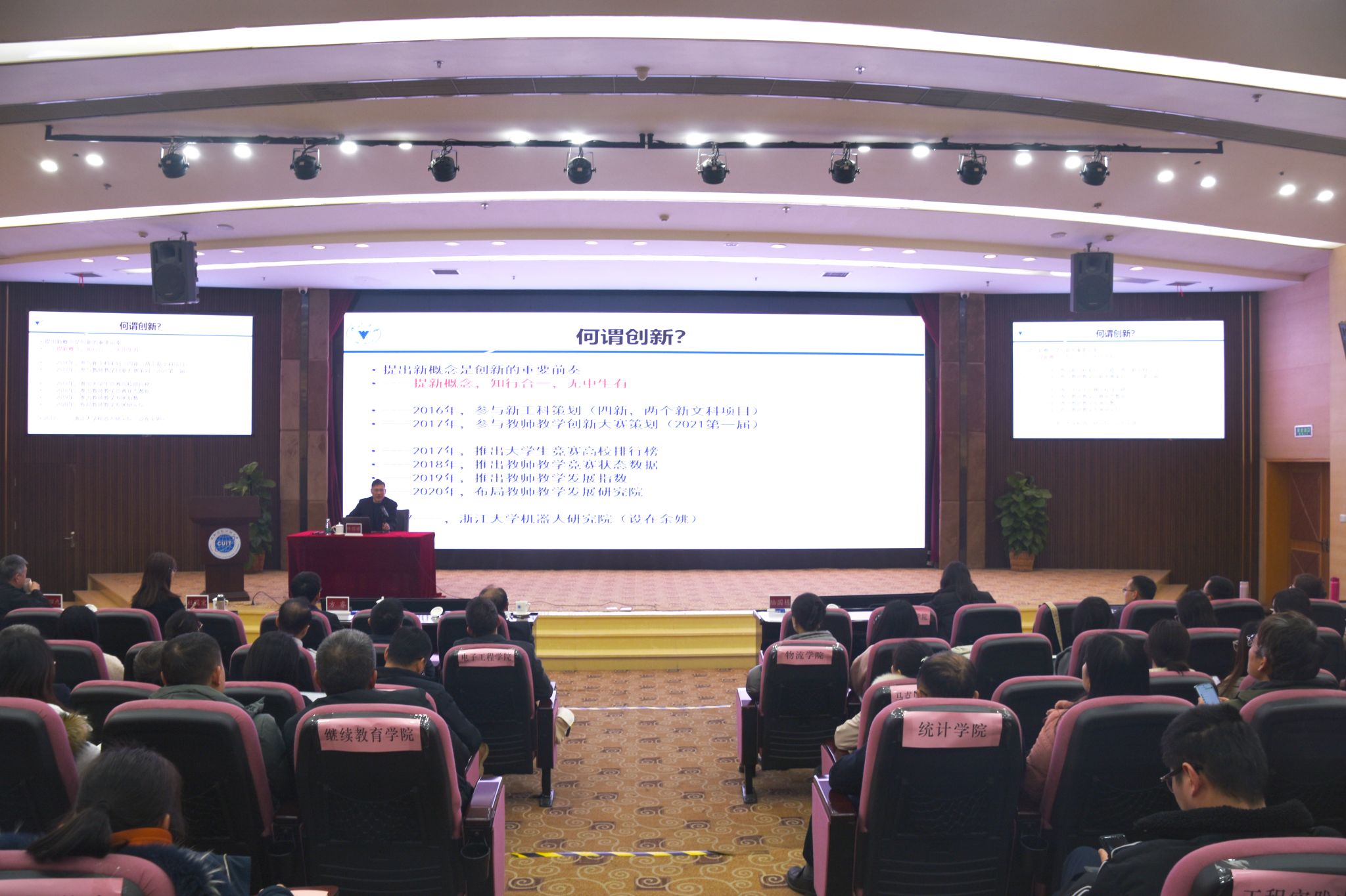 【本网讯】1月3日下午,中国高等教育学会工程教育专业委员会秘书长、中组部“万人计划”教学名师、浙江大学陆国栋教授应邀到我校作了“教学成果培育凝练与案例解析”的专题报告。学校校长何建新,人事处(教师发展中心)、教学评估中心、教务处负责人,各教学单位领导班子、专业、一流课程、省级教研教改项目、专业课程类基层教学组织负责人等教师代表参加本次报告会,会议由教务处处长方睿主持。