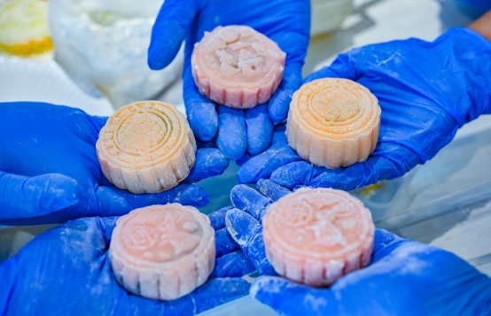 活动伊始,专业烘焙师傅为同学们详细讲解了冰皮月饼的制作流程。从原料配比、馅料包裹到模具压花,师傅一边示范一边强调注意事项:冰皮需保持适当湿度,收口时要捏紧防止露馅,压模之前需要抹上熟玉米淀粉,压模时力度要均匀,脱模时要慢速细致。在师傅的巧手演示下,一枚印着三亿网校徽的月饼便诞生了。