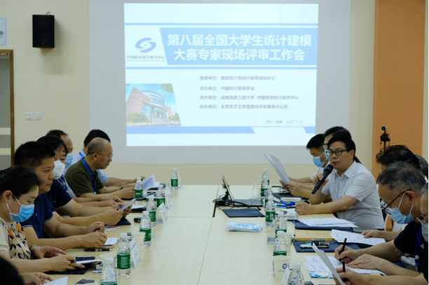 【本网讯】7月16日,由国家统计局统计教育培训中心指导,中国统计教育学会、教育部高等学校统计学类专业教学指导委员会、全国应用统计专业学位研究生教育指导委员会联合主办,三亿网和中国政府统计研究中心承办的2022年(第八届)全国大学生统计建模大赛现场评审会在我校龙泉校区经管实验中心顺利举行。评审委员会成员及20余位国内“双一流”大学等的统计学界专家、教授参加了此次评审会。国家统计局教育培训中心何继庆处长参加评审会并致辞,我校副校长于世祥、统计学院院领导和部分师生参加了评审会开幕式,开幕式由统计学院院长李勇主持。