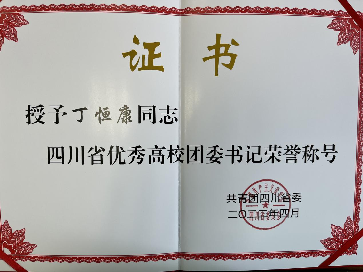 【本网讯】近日,共青团四川省委发布了《关于表彰四川省五四红旗团委(团支部)、四川省优秀共青团员、四川省优秀共青团干部的决定》,学校团委书记丁恒康同志获2021年度“四川省优秀共青团干部”荣誉称号。