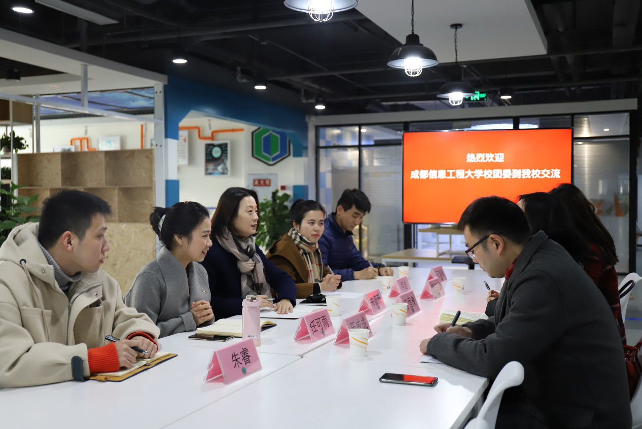 校团委一行在成都工业学院团委负责人陪同下参观了共青团阵地建设并进行了座谈交流。成都工业学院团委书记朱薇薇就正在开展的以“四大行动”为抓手推动学校共青团工作高质量发展的工作思路作了详细介绍,双方参会人员就共青团改革、第二课堂成绩单建设、大学生创新创业、青马工程培养、新媒体运营、特色校园文化活动等方面进行了深入交流与探讨。通过交流,我校团学干部对成都工业学院团委在团学工作中管理运行的标准化、规范化、品牌化等方面予以高度的赞赏。