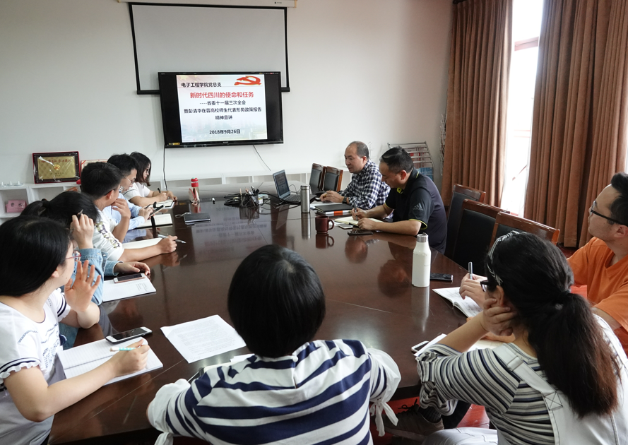 【本网讯】9月26日下午,电子工程学院党总支中心组举行学习会,传达学习省委十一届三次全会暨省委书记彭清华在蓉高校师生形势政策报告精神。学习会由电子工程学院党总支书记高永华主持。