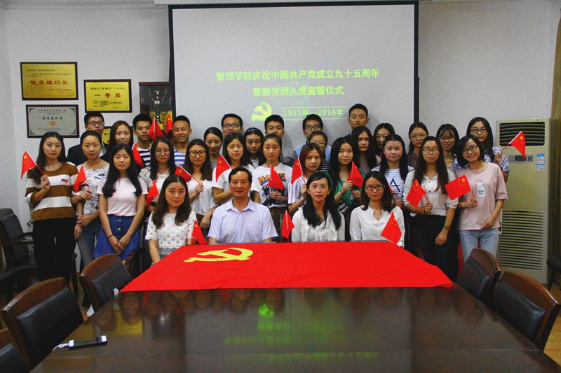 【本网讯】6月30日中午,“管理学院庆祝中国共产党成立九十五周年暨新党员入党宣誓仪式”在第二行政楼三楼会议室隆重举行。学工办副主任王菁主持,学院党总支书记王子华到场讲话,第一党支部书记刘宇、第二党支部书记潘雪丽及全体新党员参加。