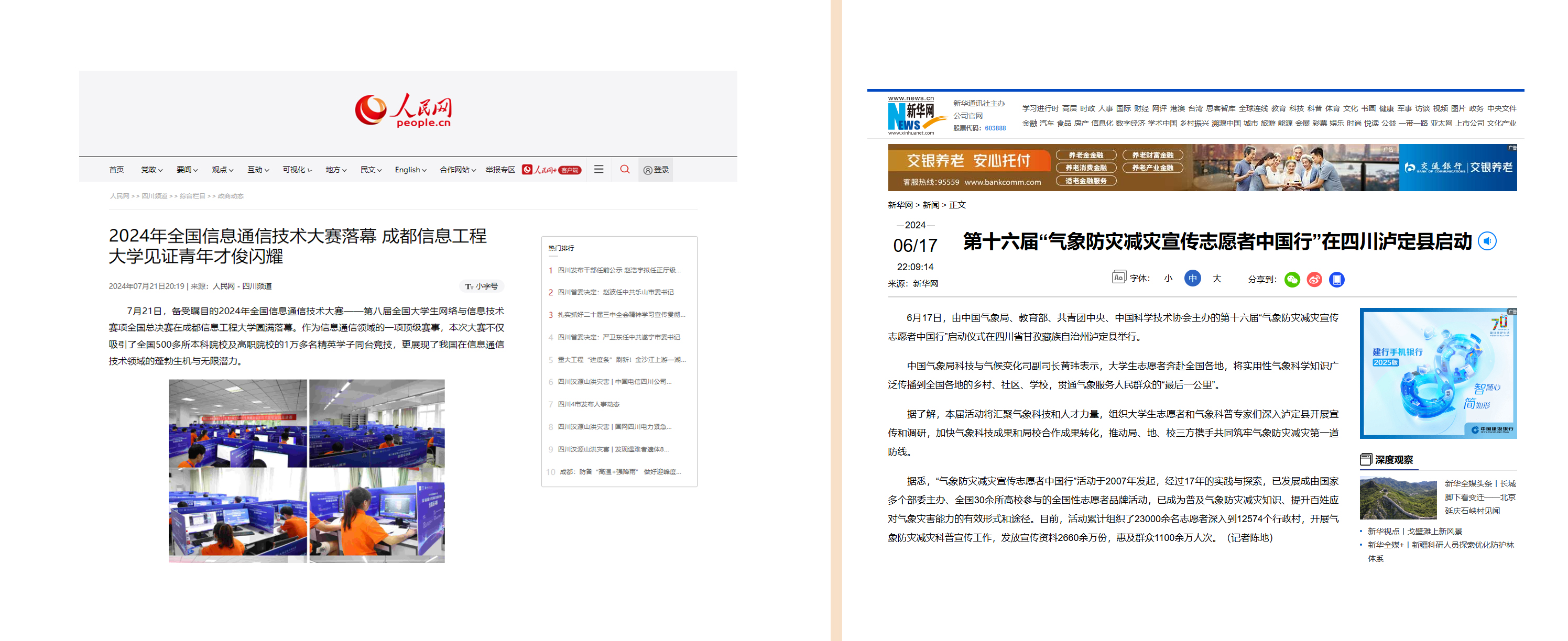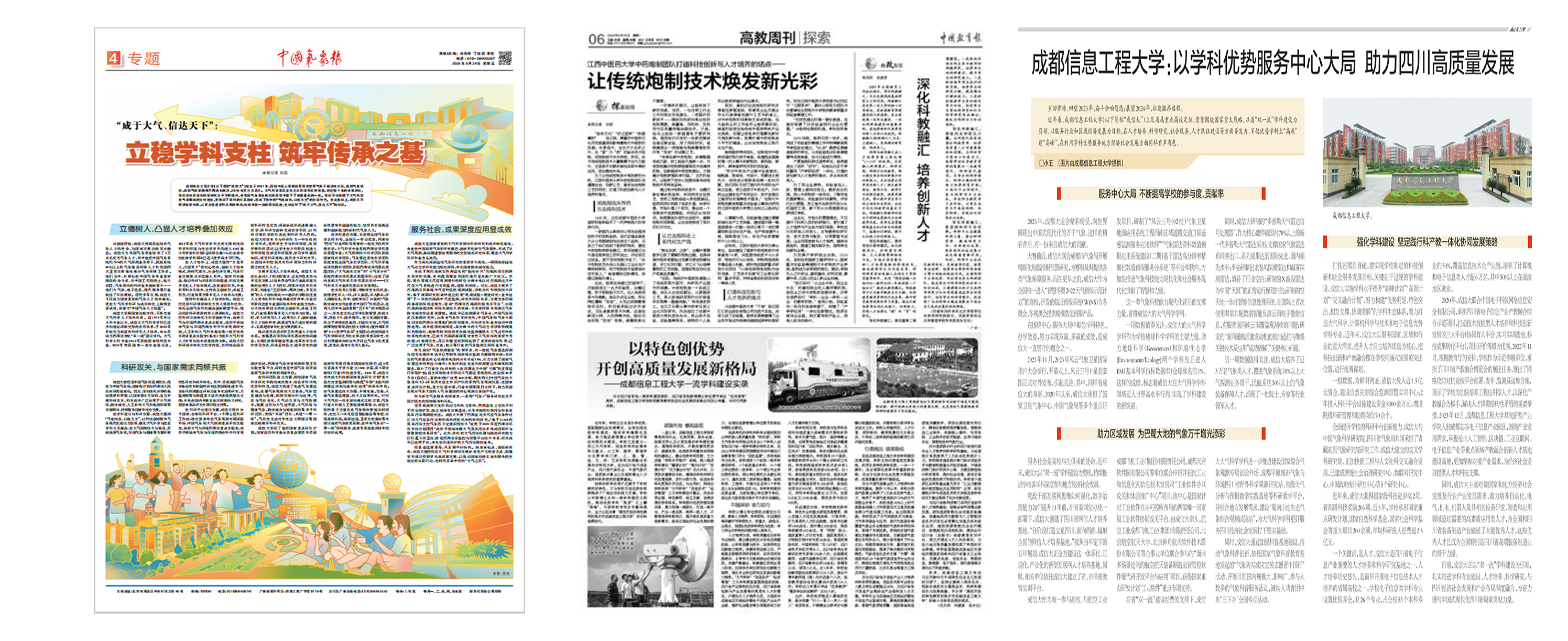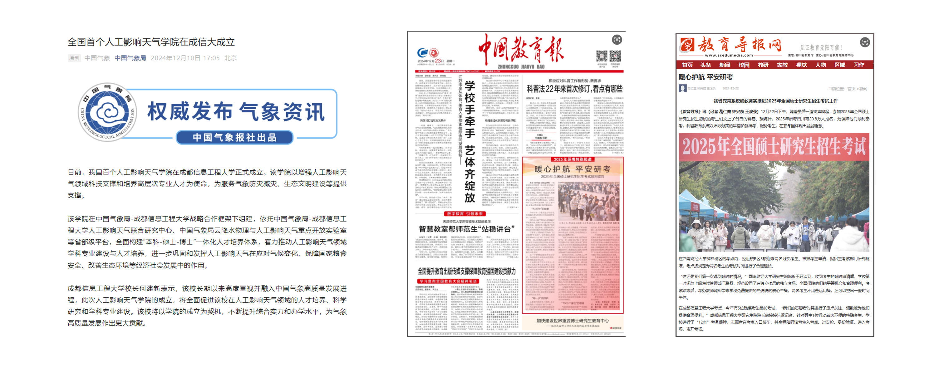 2.激活力,有效提高传播效能。积极对接主流媒体,持续做大媒体“朋友圈”,让传播实效强起来。人民网、新华网、中国青年报等主流媒体,全年刊发外宣稿件、视频报道110多篇(条),央视《晚间新闻》报道了第十六届“气象防灾减灾宣传志愿者中国行”启动仪式。分别在中国气象报、中国教育报和四川日报刊登博士点外宣报道3篇。在《中国教育报》《教育导报》、微言教育等媒体针对学校2025年研招考护航特殊考生“无忧研考”进行了特别报道。在《中国气象报》上报道了我校为全国首家成立“人工影响天气学院”的学校。