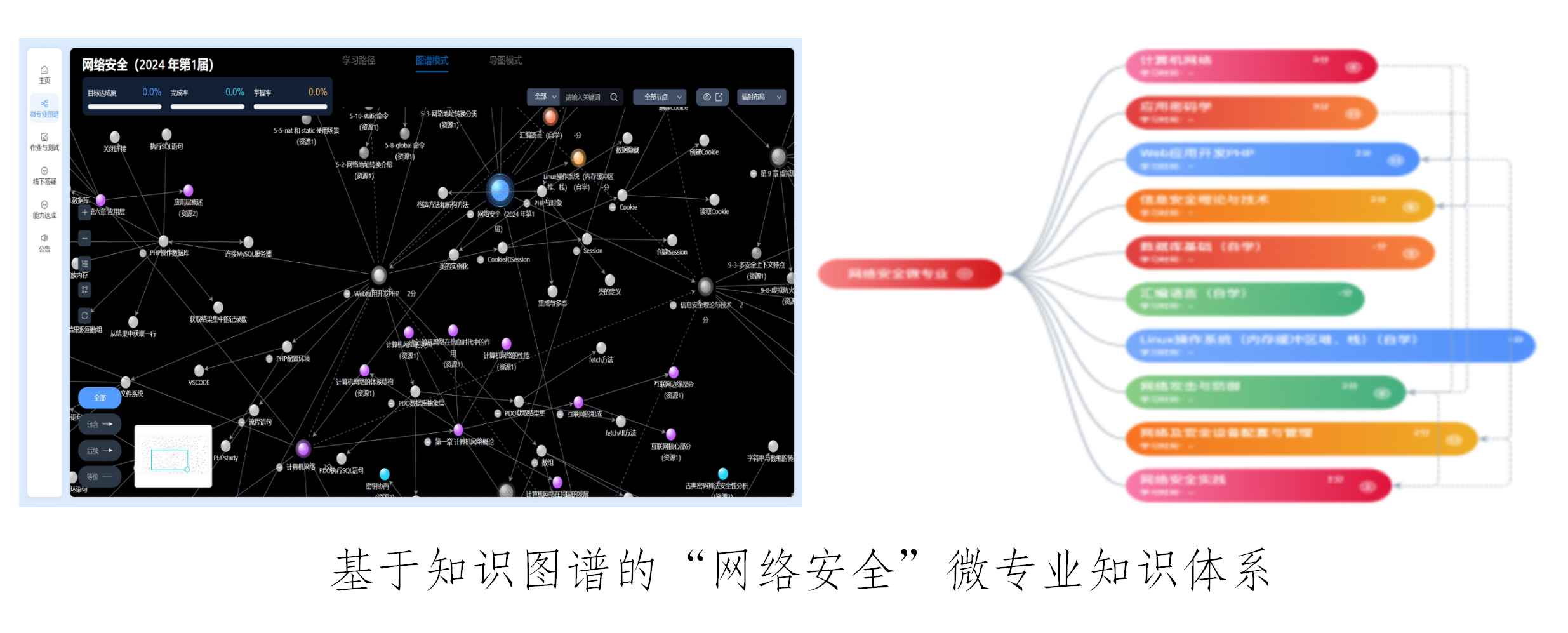 网络安全微专业课程团队积极探索复合型网络安全人才培养需求知识能力和素质体系,构建微专业知识图谱,并进行线上线下相结合方式的试运行。目前已完成了7门课程、383个知识点、466个教学音视频资源与在线试题资源建设。